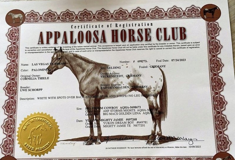 da draußen. Ich bin Las Vegas und im August 2023 auf diese tolle Welt gehüpft. Alle waren total begeistert, von meiner schicken Zeichnung und der tollen Farbe die ich meinem Vater Cowboy verdanke. Cowboy hat eine hervorragende Abstammung und auch ich bekomme diese mit amerikanischem Papier. Ich wachse im sozialen Herdenverband auf, und habe auch richtig tolle Spielkameraden. Bin aufgeschlossen, neugierig und natürlich auch verspielt, aber für jede Sparte des Reitsports offen. Aktuell bin ich schon 1,55m groß. Es wird gesagt das Appaloosa Pferde einzigartig sind und viele sagen das sie die schönsten Pferde der Welt sind. Es wird Pferd der Champions genannt,es gibt nichts wofür es nicht geeignet wäre. Appaloosa werden für Dressur, Springen,Tracking und auch für Rennen eingesetzt. Sie haben bis heute jeden erdenklichen Wettbewerb gewonnen. Wenn ich euer Interesse geweckt habe, dann kommt gerne schnell vorbei. Ich würde mich sehr darüber freuen dich kennenzulernen.