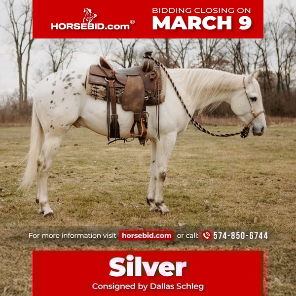 ℳ𝒶𝓇𝒸𝒽 ♦️𝐑𝐈𝐃𝐄𝐑'𝐒 𝐂𝐇𝐎𝐈𝐂𝐄♦️ Happening now thru MONDAY | MARCH 9th - Available EXCLUSIVELY on HorseBid's website! For more details and to register visit: www.Horsebid.com CONSIGNOR CONTACT: Dallas Schleg 574-850-6744 LOCATION: North Judson, IN BREED: Appaloosa REGISTERED: Yes REGISTERED NAME: OLD FASHIONED SILVER COLOR: Black/white leopard HEIGHT: 14.3 AGE: 5 GENDER: Gelding Silver is a five year old ApHC gelding that stands 14.3! I’ve never come across a horse this intelligent in a long, long while. I’ve had the pleasure of riding this horse for 6 months now and it has truly been one of the funnest experiences! His stop and turn around are big, smooth, and seemingly effortless! He rides light and supple in the in the face and body no matter what bit or bridle you put on him! Although he does not have a %100 finished reining handle on him, he is well started and can execute slide stops, spins, lead changes, and side passing! I’ve also been working him for the last 30 days on the Buffalo and he is in love with it! He watches the Buffalo like a hawk and his rate and is easy and natural! We have rode silver outside quite a lot as well and have roped the lead steer and out in the pasture and trail ridden him at the local state park. Although Silver is alert to everything around him, he is not spooked or startled easily! He crosses logs and water with ease and the presence of deer and turkey has not phased him at all! We have some cool videos for everyone to check out and we are excited to offer this unique and flashy colt! If you have any questions or want to come check this guy out in person, please contact us at 5748506744!