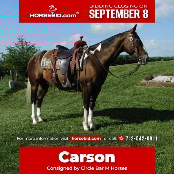 ♦️ 𝐭𝐡𝐞 𝐒𝐞𝐩𝐭𝐞𝐦𝐛𝐞𝐫 𝑺𝒆𝒍𝒆𝒄𝒕 ♦️ Happening now thru MONDAY | SEPTEMBER 8th - Available EXCLUSIVELY on HorseBid's website! For more details and to register visit: www.Horsebid.com CONSIGNOR CONTACT: Circle Bar M Horses 712-542-0911 LOCATION: Bedford, IA BREED: Pintaloosa REGISTERED: No COLOR: Bay - White HEIGHT: 14.2 AGE: 6 GENDER: Gelding Carson is a handy, ranch-type gelding that rides really well. He’s been used for doctoring cattle, checking pastures and penning cattle back at the sale barn, giving him a solid foundation and a good work ethic. He has lots of ranch & pasture experience, a nice size & easy to handle at 14.3hh, Current on everything and 100% sound. Carson is the kind of gelding that can go in any direction — whether you want a reliable ranch hand, trail partner, or an all-around using horse. He’s built right, rides quiet, and will look good doing whatever job you put him to. This is a very nice gelding that is a pleasure to have around and makes you want to go out and ride!