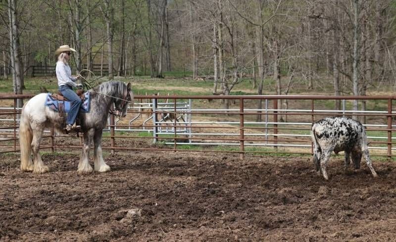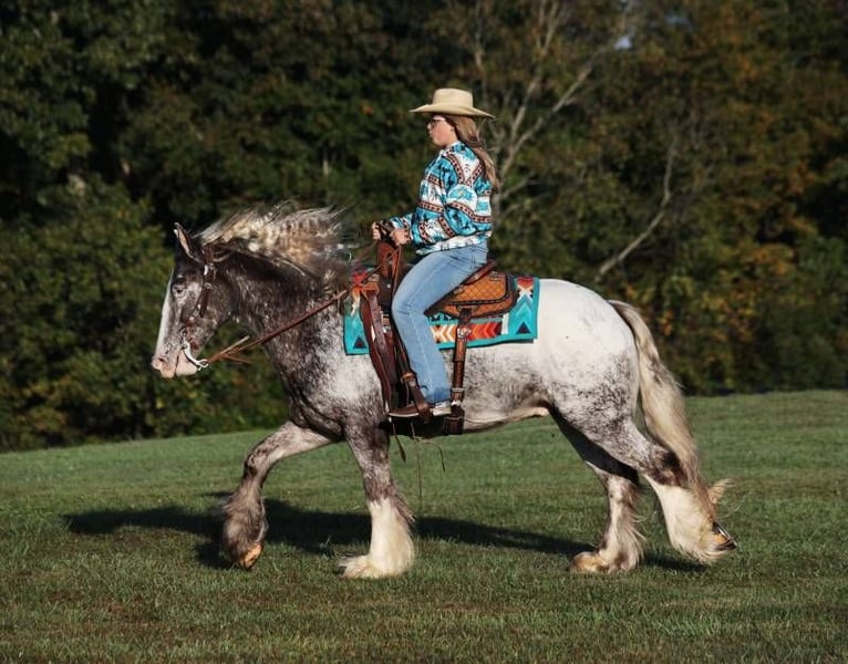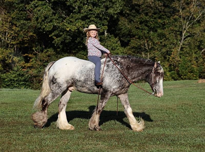 Consigned to Cowgirl Cadillacs in Sheridan, WY. Sales June 14-15th. You can bid online, phone bid or bid in person! Have you been waiting for a knight in shining armor to sweep you away? DANTE STEEL KNIGHT is what you have been waiting for! With a unique roan/appaloosa coat, fluffy feathered legs, poofy mane and tail, loving personality and a heart of gold, even the medieval era did not have a knight like this!!! Over the last year with us Dante has stole the hearts of our little girls! He is Mr. Personality and Mr. Patient! He loves attention and grooming or anything that involves interacting with people! Dante is a well built 15hh, 5 year old, Appaloosa colored, registered Gypsy Vanner gelding! He has a smooth jog, a very nice lope, he reins around and turns a circle both ways, sides passes and backs with ease! Dante knows a trick or two as he lays down for mounting/dismounting. No wonder people love gypsies; their popularity is driven by their versatility and calm nature! Dante is a true ambassador of breed. Dante can go out and ease down the trails. He will cross deep water, rough rocky areas, scale steep slopes and pick his way over deadfall, all while keeping his rider safe! He has been used around the ranch to check cattle, sort pairs and he has roped/doctored calves as well. We have had him down the highways, through town and he is safe around all traffic. He has seen the bright lights and heard the loud speakers as we had Dante in a Christmas play called “Journey Through Bethlehem” which had around 250 actors in it. Dante was ridden as a roman soldier’s horse, for several hours, as he walked up/down rows of car loads of people. Of course folks were taking pictures and reaching out their windows to pet him. Over the 2 nights approximately 8000 cars drove through the “live nativity scene”. We have tested Dante in every way that we know how and he has passed every single test with nothing less than a perfect score! He has shown us that any age and any ability level can enjoy him. If you have been waiting for your knight in shining armor to arrive… HE IS HERE!!! Call 606-308-2461 for more info.