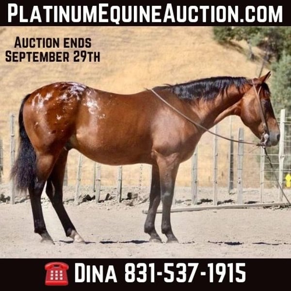 ONLINE AUCTION Place your bids at www.PlatinumEquineAuction.com Starting Bid $3500 Auction ends September 29th, 2024 Need a new saddle? Check out White Rock Saddles on our website or Facebook! Applebottom, the delightful 7-year-old Appaloosa gelding who stands at a charming 14 hands tall and is as cute as a button! With his gentle demeanor and playful spirit, this little guy is not just a horse but a bundle of joy waiting to be your new best friend. Imagine sitting sideways on him, hanging off his side, or even crawling all over him; he’s that sweet and patient. Applebottom has mastered the basics, walking, trotting, and loping in nice circles with an enviable headset that showcases his eagerness to please. He responds beautifully to cues with easy stops and smooth backups, making every ride feel like a breeze. What truly sets this boy apart is his unwavering confidence; he’s been out on streets buzzing with cars honking by without batting an eye! Obstacles like tires, tarps, balls, and flags? Bring them on he faces each challenge head-on like the true trooper he is! Applebottom is great out on adventures navigate his way up steep inclines and will cross streams with ease. Perfect for kids who are ready for some fun under guidance or any rider looking for a reliable partner in crime. Applebottom ties up like a soldier and enjoys bath time too! Whether stabled or out grazing happily in pastures, he’s always eager for companionship. If you’re seeking that special equine buddy to spark endless adventures together while building beautiful memories along the way Applebottom might just be your perfect match! Please contact Longhorn Ranch Dina 831-537-1915 located in Paicines, CA. ONLINE AUCTION Place your bids at www.PlatinumEquineAuction.com Starting Bid $3500 Auction ends September 29th, 2024 Need a new saddle? Check out White Rock Saddles on our website or Facebook!