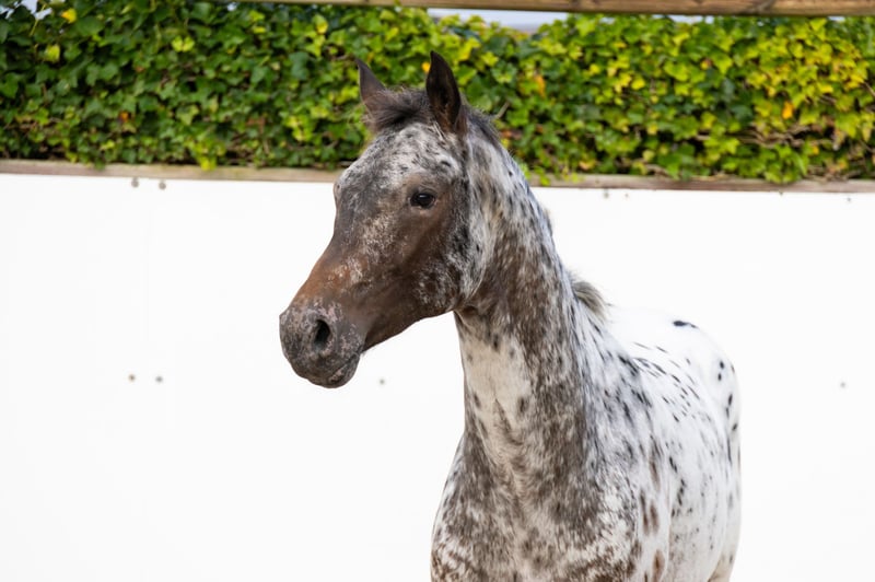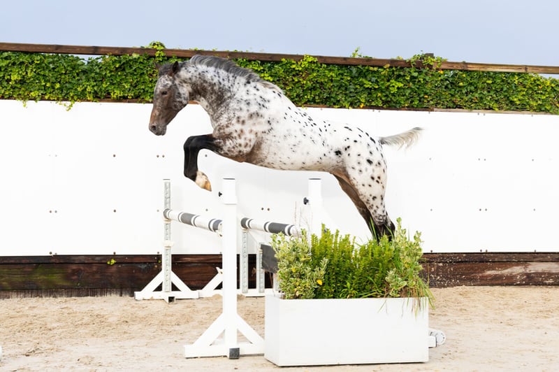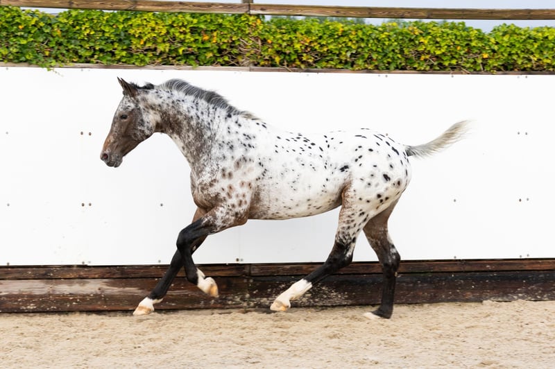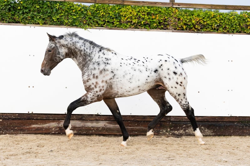 Appaloosa Sir Witteboy est un magnifique étalon de deux ans doté d’un bon mouvement et d’un caractère fantastique. Sa robe remarquable provient de son père, Sir Wittekind de Blumberg, un Appaloosa saisissant qui a sauté à 1,35 m et a participé à des concours de dressage M1. Sa mère, Chandall, une jument ZfdP par Competent x Zacharias, a également donné l’étalon de saut d’obstacles de huit ans, Dominator’s Doerthe, qui évolue à 1,45 m avec Dominic Gosert (ALL). Chandall est la sœur utérine de deux chevaux de saut d’obstacles à 1,40 m, dont l’un est également classé ZZ Zwaar (niveau Intermédiaire Avancé), ainsi que de deux autres chevaux de saut à 1,30–1,35 m. https://youhorse.auction/en/auction/Sir-Witteboy-B-BLUMBERGS-SIR-WITTEKIND-x-COMPETENT