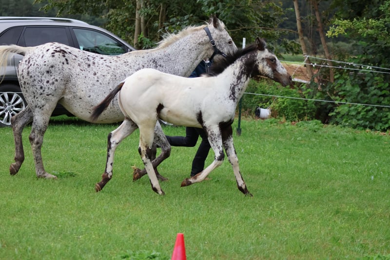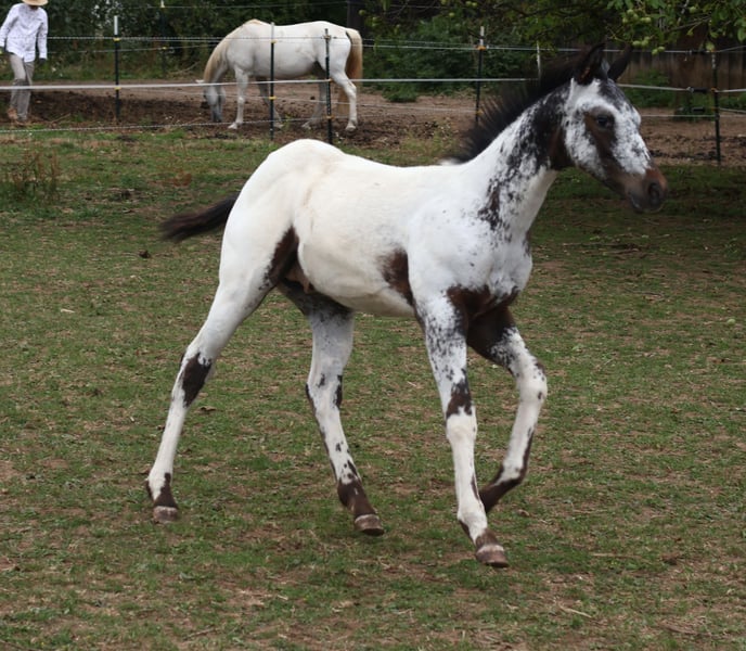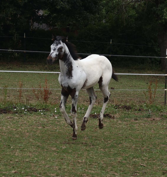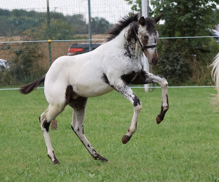 Zum Verkauf steht ein athletisches wunderschönes Few Spot Hengstfohlen mit dem Namen: BK White Cloud. Der Junge Mann ist sehr Menschen bezogen und kennt das Fohlen ABC Sein Vater ist der von uns gezogene BK Ragnar Olena, ein gekörter Hengst von unserem Ima Sioux Olena, der ebenfalls gekört ist. Seine Mutter ist unsere Roxys Lady in Dark, ihre gesamte Nachzucht ist prämiert. Also ein sehr interessantes Fohlen für Zucht und Sport. Dabei: COR und Equitenpass vom APHCG For sale is a beautiful, athletic, few-spot colt named BK White Cloud. This young man is very people-oriented and knows the ABCs of foaling. His sire is BK Ragnar Olena, a licensed stallion bred by us, by our Ima Sioux Olena, who is also licensed. His dam is our Roxys Lady in Dark, and all of her offspring have won awards. So, a very interesting foal for breeding and sport.