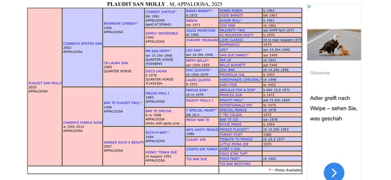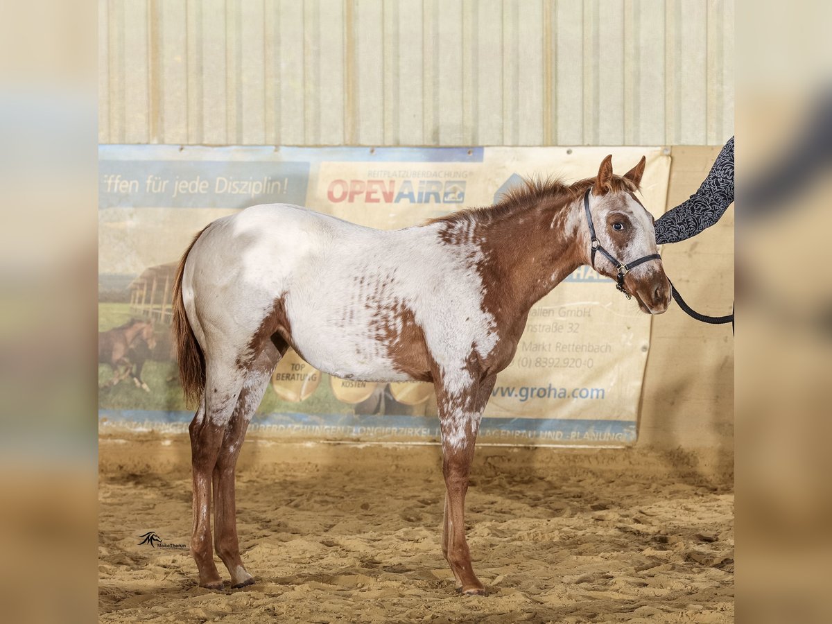Zum Verkauf steht eine wunderschöne Appaloosa Stuten, geboren im April Jahr 2025. Mit einem geschätzten Stockmaß von 152cm ca. ist sie die ideale Partnerin für Western-Reiter, die auf der Suche nach einem vielseitigen und charakterstarken Pferd sind. Molly kennt schon den täglichen Alltag mit Halftern , führen auf die Koppel , anbinden , putzen , Tierarzt, Hufschmied usw . Traktoren , Motorsägen, Rotwild Diese Stute zeichnet sich durch ihr freundliches Wesen und ihre Lernbereitschaft aus. Sie ist gut erzogen und möchte immer gefallen . Ihre auffällige Fellzeichnung macht sie zu einem echten Blickfang. Sie eignet sich sowohl für den Freizeitbereich als auch für den Turniersport ist natürlich auch sehr interessant für die Zucht ( LP/LP Trägerin vererbt somit immer bunte Fohlen ) Bei Interesse oder für weitere Informationen stehe ich gerne zur Verfügung. Auf dem Bundeschampionat 2 platziert!! Plaudit San Molly ( LG 1 prämiert ) Ca 151 Sire: Cowboys Spoted San DAM: Charmys Purpel Rose Farbe Sorrel Fohlen ist 5 Panel doppelt NEGATIV über die Elterntiere Geimpft, regelmäßig entwurmt!! Registriert beim APHCG und APHC …. E Pass von APHCG und Orginal COR von APHC✅ Kommt nur in beste Hände , ⭐️⭐️⭐️⭐️⭐️ Sterne zuhause !!!