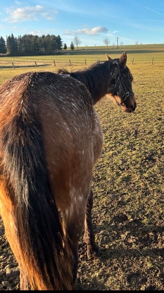 Sana (geb. 14.06.2024) ist eine typvolle junge Stute mit schöner Zeichnung und sehr klarem, ruhigem Wesen. - Bay Varnish Roan Appaloosa - halfterführig - verladefromm - klar im Kopf - brav im täglichen Umgang - aktuell roh (altersgerecht) - ideal für: Freizeit, weitere Ausbildung, oder interessant für Farbzucht Der Verkauf erfolgt aus Altersgründen im Rahmen einer Bestandsverkleinerung eines über viele Jahre aufgebauten Pferdebestandes. Es handelt sich ausdrücklich nicht um Notverkäufe.