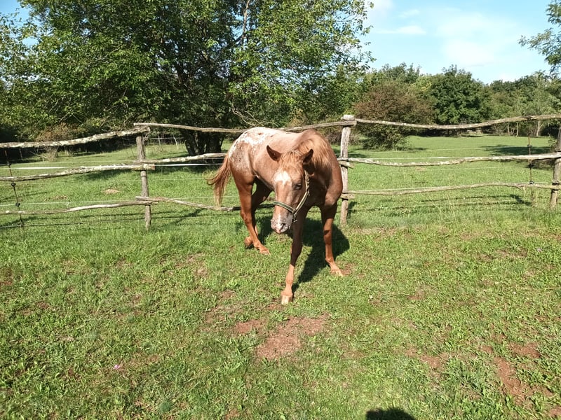 Nous avons une jument à vendre, elle s'appelle Angie Crystal Bowie, Appaloosa pur sang, numéro # 692373. Son père est AB Slash Bowie, sa mère Crystal Secret Blue. Elle est née le 29 mai 2021. Elle est actuellement enceinte depuis juillet avec notre étalon Bright Moonlight Bar, qui est un étalon Appaloosa agréé. Angie est un cheval vraiment spécial, très douce et polie, mais aussi avec une étincelle en elle, quand elle est montée, elle aime vraiment courir, mais peut être arrêtée avec le plus léger des touchers... Nous avons utilisé uniquement un sidepull sur elle, pas de mors, elle n'en a pas besoin. Angie est dressée en western, idéale pour la monte, également facile à manipuler pour les débutants et a de bonnes habitudes. Nous ne vendrons qu'à de bonnes mains, où elle sera principalement à l'extérieur, pas dans un box.