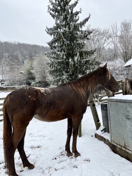 Aussergewöhnliche Walkalloosa-Jungstute (Rockmountain Horse/Appaloosa) mit Gangveranlagung Dmrt3-Tölt-Gen zu verkaufen, im März 4 Jahre alt. Adsila ist im Herdenverband aufgewachsen, Ausbildung am Boden: nach Tellington und Grundkenntnisse Horsemanship; ging häufig ins Gelände als Handpferd, Barhuftrimming. Sie ist sehr gut gebaut und hat schöne, schwungvolle Gänge, Minipanel Genetic Test. Sie kommt nun in professionellen Beritt oder falls die zukünftige Käuferschaft dies selber tun möchte, wäre dies auch eine Option. Nur in absolut gute Hände wegen Bestandesverkleinerung und Aufgabe der Zucht abzugeben. Walkalloosa: RockymountainHorse/Appaloosa Kostenpunkt: Euro 9'500 - 14'500..--, je nach Ausbildungsstand, Standort Lörrach