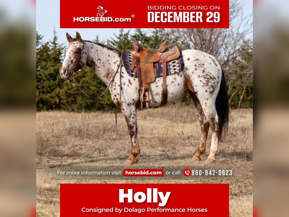 ⚜️𝐓𝐇𝐄 𝓗𝓮𝓻𝓲𝓽𝓪𝓰𝓮 𝐖𝐢𝐧𝐭𝐞𝐫 𝓒𝓵𝓪𝓼𝓼𝓲𝓬⚜️ Happening now thru MONDAY | DECEMBER 29th - Available EXCLUSIVELY on HorseBid's website! For more details and to register visit: www.Horsebid.com CONSIGNOR CONTACT: Dolago Performance Horses 860-942-0623 LOCATION: Perry, OK BREED: Appaloosa REGISTERED: Yes REGISTERED NAME: ALITA RED SUNSHINE COLOR: Appaloosa HEIGHT: 14.3 AGE: 6 GENDER: Mare Holly is a beautiful appaloosa mare with tons of chrome, eye appeal, and class. She’s the kind that turns heads everywhere she goes and backs it up with a great mind and a solid foundation. Holly has been going well in the roping pen and has been hauled to jackpots, where she shows plenty of rate, a big stop, and the ability to read cattle. She’s athletic, responsive, and has a lot of try, making her fun to ride and easy to get along with. Holly is a truly well rounded mare that has been ridden both English and western. We’ve recently started her over fences and she’s taken right to it, showing a willing attitude and seeming to genuinely enjoy jumping. She’s also been patterned on the barrels and poles, giving her a solid start for someone wanting a versatile performance prospect or an all around using horse. Outside of the arena, Holly really shines. She’s excellent on the trail and is just as comfortable riding out alone as she is in a group. She crosses water, logs, bridges, and other trail obstacles with no hesitation and takes everything in stride. She’s confident in new environments and stays level headed whether you’re riding at home or hauling her somewhere new. Holly has a one hand neck rein, has a smooth lope with pretty, balanced circles, and is soft in the bridle. She’s been exposed to a variety of situations and handles it all with a great attitude. Whether you’re looking for a rope horse, a ranch style all around, a fun jackpot horse, or something you can switch gears with and enjoy English, western, or trail riding, Holly checks a lot of boxes.