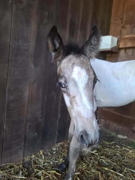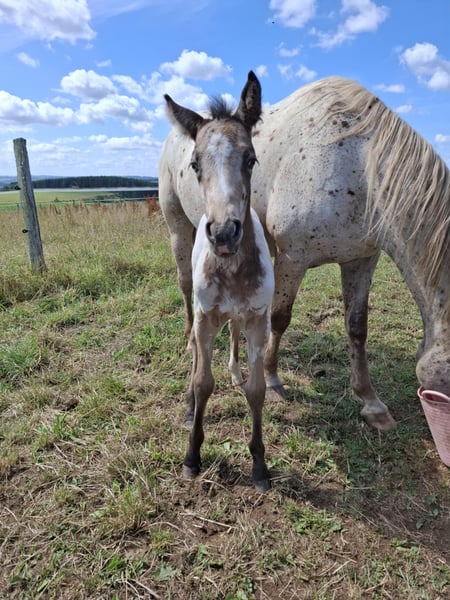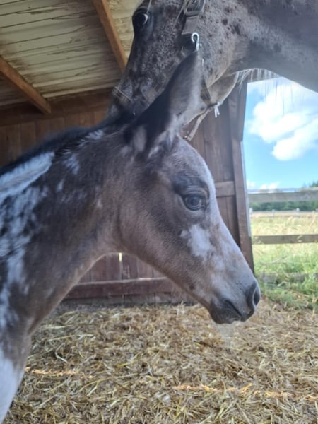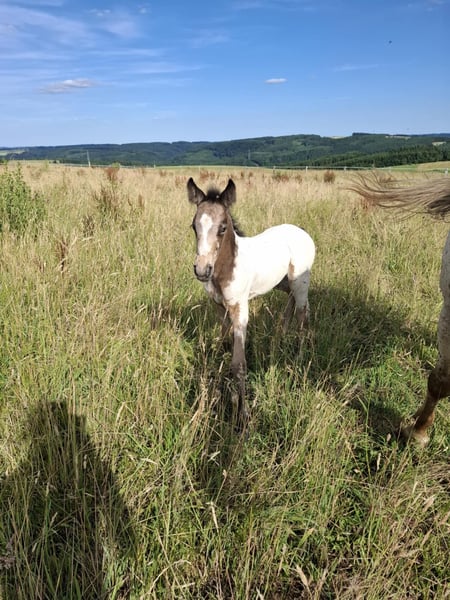 Fohlen in isabellfarbener Few Spot (Ee Aa Cr/n LP/LP Patn1/?; 5-Panel n/n durch Abstammung), abstammend von Hélia (ONC typ Appaloosa x Quarter) und Makee Cream Illusion (Appaloosa Foundation PP). Erwartete Größe zwischen 1,50 m und 1,55 m. Ciéra de Fayala wurde am 27. Juni 2025 auf der Weide geboren. Dieses hübsche Mädchen wird seit ihrer Geburt in einer Herde im Freien aufgezogen. Sie ist bereits sehr menschenbezogen, neugierig und recht selbstsicher im Umgang mit ihren Artgenossen. Sie hat eine eher ausgeprägte, extrovertierte Persönlichkeit wie ihre Mutter, bleibt dabei jedoch freundlich. Sie wird nach gesundem Menschenverstand und mit ethologischen Reitmethoden behandelt. Sie wird geimpft, entwurmt, beschlagen, mit Pass ausgestattet und steht zur Verfügung bei der Absetzerzeit (Frühling 2026), die je nach Mutter und Fohlen stattfinden wird (futtertechnisches Absetzen wahrscheinlich mit etwa 10 Monaten). Nur für ein 5-Sterne-Zuhause, mit einer zukünftigen Lebensweise, die den grundlegenden Bedürfnissen am nächsten kommt. Verkauf unter Vertrag.