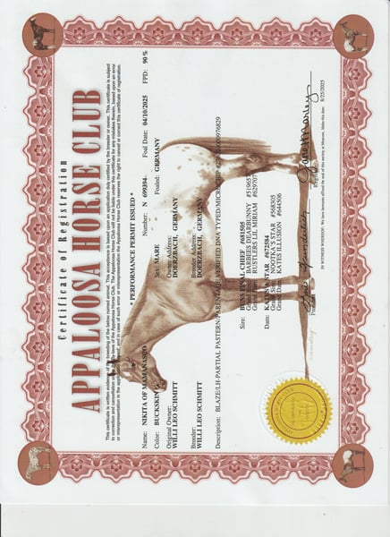 Nikita of Mamansco nie tylko wygląda przepięknie w swoich czarnych overknees, ale także zachwyca swoją przyjacielskością. To źrebię, które nigdy nie było agresywne. Niki ma potrzebę, aby zbliżać się do ludzi i nie czuje się ograniczona, wręcz przeciwnie, uwielbia być przytulana. Podczas zakładania kantara czy czapki przeciw owadom stoi spokojnie, jak 15-letnia klacz, więc jest wspaniała w obcowaniu. Regularnie ćwiczymy również podnoszenie nóg; przy tym z każdym razem widać postęp, co pokazuje mi, jak bardzo Niki jest zdolna do nauki. Niki otrzyma dokumenty US i ma 90% krwi FPD, co oznacza wysoki udział krwi Appaloosa. Przeprowadziliśmy już test 5-panelowy w laboratorium, aby udokumentować, że Niki jest wolna od typowych chorób, na które narażone są Appaloosy. Nikita of Mamansco jest mocno ukształtowana przez słynną linię "Toby". Potomstwo Toby'ego występuje wielokrotnie w linii matki. Na wszystkie nasze konie wpływa codzienny, stosunkowo intensywny kontakt z nimi: zakładanie kantara i spacer na pastwisko przez ponad 500 m wzdłuż ruchliwej drogi, to jeden z przykładów. Wiele rzeczy jest dla Niki już oczywistych: "Czego się nauczyło małe Hans, nie trzeba później trudzić się, aby nauczyć dużego" :-)