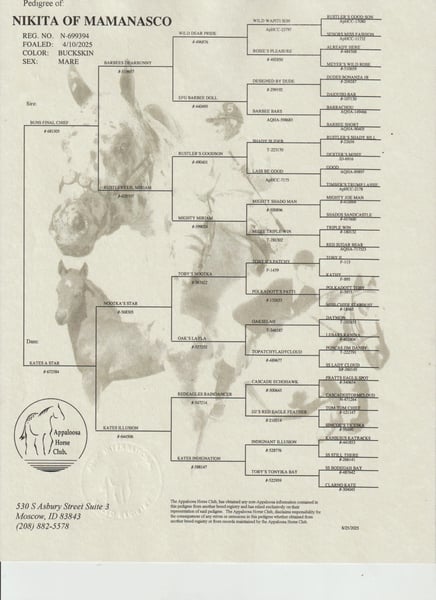 Nikita of Mamansco is not only stunning with her black overreach boots, but she also captivates with her affectionate nature. A foal that has never kicked out. Niki has the urge to come to people and does not feel restricted; she loves to be held. When haltering or putting on a fly mask, she stands still like a 15-year-old, making her wonderful to handle. We are also regularly practicing lifting her legs; with each session, you can see the progress, which shows me how trainable Niki is. Niki will receive US papers and is 90% FPD, meaning she has a high percentage of Appaloosa blood. We have already conducted a 5-panel test from a laboratory to document that Niki is free from the typical diseases that Appaloosas are prone to. Nikita of Mamansco is strongly influenced by the famous "Toby line." Toby descendants are present multiple times in her maternal lineage. What affects all our horses is the daily relatively intensive handling: haltering and walking over 500 meters to the pasture along a busy road is one example. Many things are already second nature to Niki: "What little Hans has learned, big Hans does not have to be taught painstakingly later" :-)