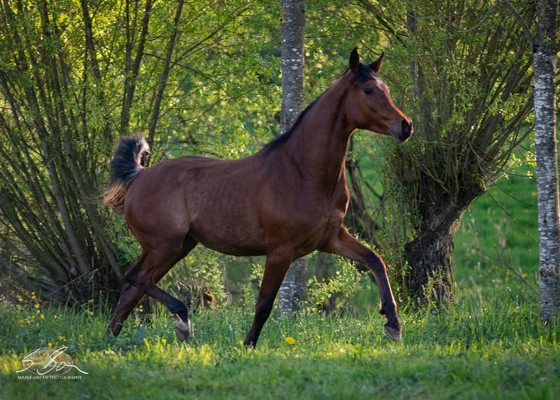 Mahmoud is a purebred Egyptian, energetic, and typy young stallion with a lovable character. He is correctly built with strong, well-angled foundations, a powerful body, and a good topline. His typy head transitions into a well-formed neck with a slight arch, which is well-set on a long, sloping shoulder. He has expansive, elastic movements and a people-oriented, affectionate character. He possesses good nerves and is a "really cool guy." All of this makes him a promising partner for endurance riders and ambitious recreational riders. Both his mother and father are good riding horses. Due to his lineage, excellent conformation, and wonderful character, he is also interesting for breeding. He is free from the genetic defects SCID, CA, and LFS. Mahmoud is familiar with groundwork, farrier work, trailer loading, children, cows, cats, dogs, chickens, large agricultural machinery, and road traffic—essentially, everything a young horse needs to know. He has grown up in a herd and is therefore well-socialized. Upon request, Mahmoud can also be gelded and sold as a gelding. Further upbringing in the stallion herd on-site is possible.