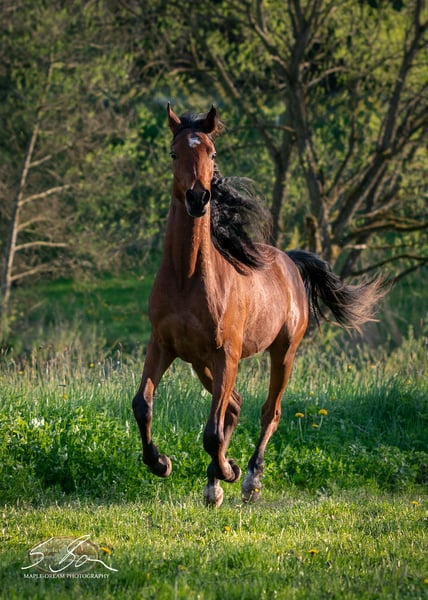 Mahmoud is a pure Egyptian, expressive young stallion with a strong, energetic movement and a lovable character. He is correctly conformed, with solid, well-angled foundations, a muscular body, and a good topline. His typy head flows into a slightly arched neck that is well-set on a long, sloped shoulder. He has expansive, elastic gaits and a friendly, people-oriented personality. He possesses good nerves and is a truly cool and confident horse. All these qualities make him a promising partner for endurance riding as well as for the ambitious leisure rider. His dam and sire are both good riding horses. Due to his lineage, excellent conformation, and wonderful character, he is also of interest for breeding. He is free from the genetic defects SCID, CA, and LFS. Mahmoud is familiar with ground work, farrier visits, trailer loading, children, cows, cats, dogs, chickens, large machinery, road traffic, and more—basically, everything a young horse should know. He was raised in a herd and is well socialized. Upon request, Mahmoud can also be gelded and offered as a gelding. Further upbringing in the stallion herd on-site is possible.