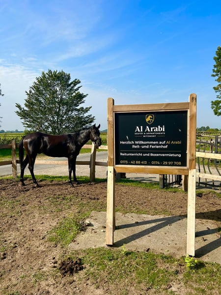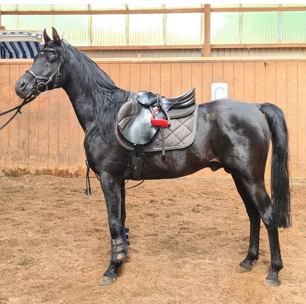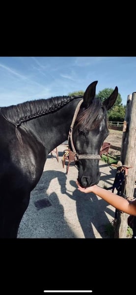I have a thoroughbred Arabian gelding A black beauty with great pedigree, his dad and mom can be viewed with us, they are super riding horses. Mir has a lot of type, big eyes, strong back and strong foundation, a horse and buddy for the whole family, at the moment he is 152 cm tall is ridden 4 times a week and suitable for beginners I have never been ill, he is curious and capable of learning, likes to work but also cuddles. He likes to go for a ride and is very well-behaved and calm He knows dogs, lunging, tractor, farrier and is very social Due to lack of time he is looking for a new loving home. Important are his parents on the second (stallion with saddle) and third picture (mare with side view)