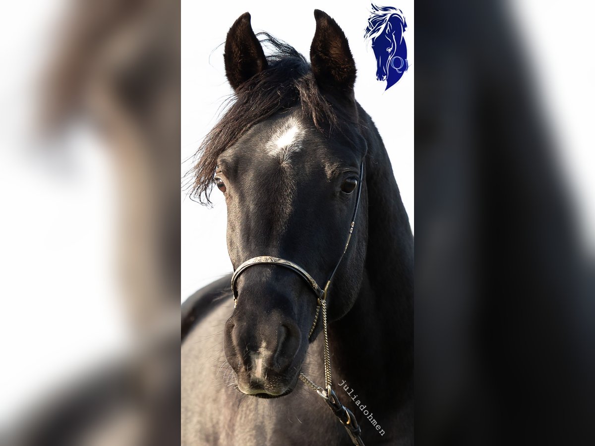 Straight Egyptian Arabian Warmblood, Imported from the USA, homozygous black, for breeding purposes. AVS NL registered. Qaz is a handsome young stallion with strong and correct conformation. He measures 155 cm and is just over 3 years old as of September 2025. Homozygous black rabicano. He inherited the luxurious mane of his grandsire, Sheik Imaan. He has a very stable temperament, very calm in his demeanor. Not nervous, no squealing. Good with younger horses, respectful towards mares. This year, his first foal will be born in the USA. The mare was pregnant after the first breeding attempt. Professional photos and videos will follow in spring. Qadir is also available; a straight Egyptian grey stallion, 150 cm, top-line. Breeding fee €1100. See other listing. Available for natural coverings. Fresh semen at K.I. station also possible. Travel arrangements with the stallion(s) can be made upon request (NL, DE, BE, Austria, Switzerland, Slovenia, Croatia). Costs for fresh semen K.I. or travel to the mare/stallion (with foal) are additional and are the responsibility of the mare owner. Transportation of the mare to QY can also be arranged for a reasonable fee. Foal guarantee: if a colt is born, you will receive the next breeding at half price. Live foal guarantee. **Apart from the covers covered by the guarantee, no repeats of matings will be made. This ensures your foal has an exclusive pedigree.** Serious, neat inquiries will receive a serious, professional response. Please preferably contact via WhatsApp +31 610 271771. Anonymous or random questions here will not be answered. Your first name and phone number are appreciated.