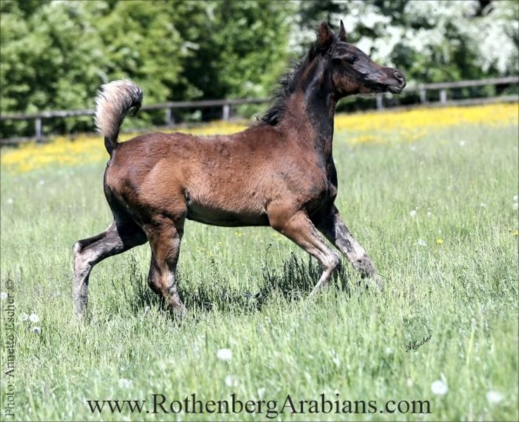 Exotic pretty bay Straight Egyptian yearling filly with black gene for sale! Father is our homebred black stallion GR Madhin (full-brother to our homebred black Champion-mares GR Marietta & GR Marianah; by our black Gold premium foundation stallion Madallan-Madheen), the mother is a daughter of our black Gold premium stallion Maheeb from the same motherline as our “Queen” GR Nashidah! Other exotic typey black, bay & grey Straight Egyptian foals, youngsters and breeding horses for breeding, show and sport for sale! Pearls from worldwide wellknown and successful breeding, famous and proven pedigrees and special people-loving characters! Detailed information, prices and conditions on request, please call at 0049 / 9091 / 3707 or send an e-mail including some information about you - thank you! More information to our breeding-horses and some sale-horses you find at our homepage www.RothenbergArabians.com, other sale-horses (also horses bred and owned by clients) on request! Please also visit us at instagram @RothenbergArabianStud