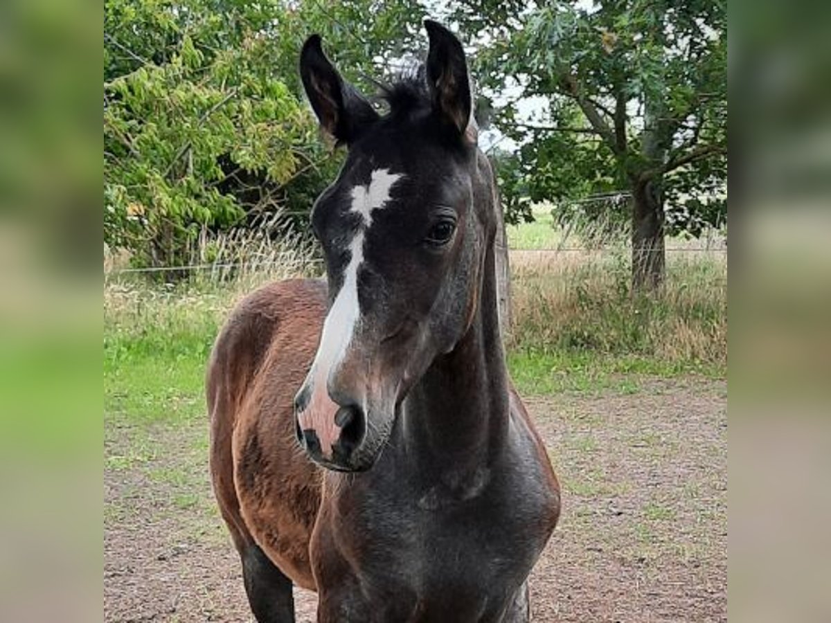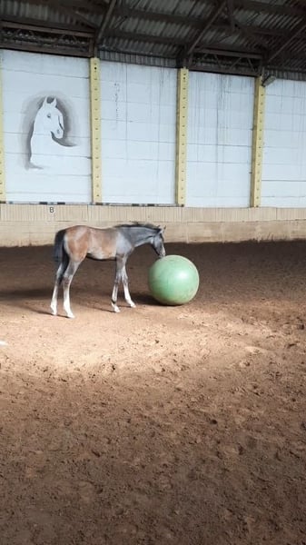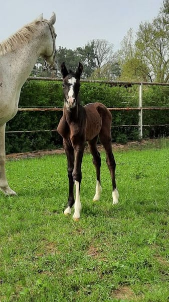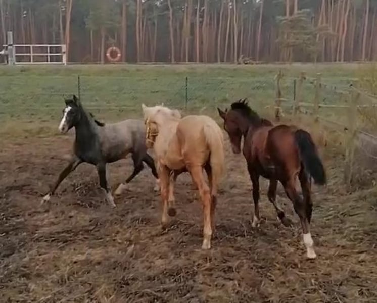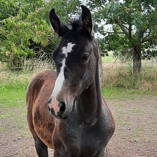 Mithril ist ein sehr schicker Jährling mit auffälliger Zeichnung und korrektem Fundament. Er wird allerdings Schimmel werden und somit mehr und mehr in seinen Namen hineinwachsen: "Mithril" ist das wertvollste elbische Metall, das wunderschön silbrig schimmert. Außerdem ist es "hart wie ein Drachenpanzer und zugleich leicht wie eine Feder". Genau so sollte ein Shagya sein - bei Härte, Ausdauer und Robustheit dürfen Sensibilität, Sanftheit und Leichtrittigkeit nicht fehlen. Und diese Eigenschaften erwarten wir auch von Mithril, die er sehr wahrscheinlich von seinen Eltern geerbt hat. Doch momentan darf er einfach seine Kindheit genießen und die Welt spielerisch auf eigene Faust erkunden. Zur Fohlenmusterung wurde er Silber-prämiert (Typ sehr gut, Bewegung vorzüglich). Im Dezember 2025 wurde er abgesetzt und konnte gemeinsam mit 2 anderen Hengst-Fohlen tagsüber auf dem Paddock toben und sich nachts in der Box ausruhen, wo er neben Heu auch Hafer und Mineralstoff bekam und das Anbinden während des Hafer-Fressens geübt wurde. Charakterlich zeigt er sich bisher eher sanft-zurückhaltend und weniger frech als seine beiden Altersgenossen. Mithril ist genetisch vielseitig veranlagt. Seine Mutter Shanel N° 11 hat bereits viele qualitätvolle und prämierte Fohlen zur Welt gebracht und ist Vollschwester des Elitehengstes Salazar S (Körsieger und Prämienhengst des ZSAA 2010, vom VZAP als bester Springhengst ausgezeichnet), der über gleichermaßen Dressur- und Springveranlagung verfügt und überdies zuverlässig seinen ehrlichen Charakter und hohe Leistungsbereitschaft vererbt. Mithrils Vater Milan ist ein typvoller Rappe, der neben einem korrekten Fundament und sehr aktiver Hinterhand auch Fleiß, Arbeitsfreude und seinen Mut vererbt, den er selbst schon vielfach als "Husarenpferd" bei Showauftritten und als Führpferd bei Wanderritten unter Beweis gestellt hat. Mithril wird voraussichtlich trotz edlem Exterieur eher großrahmig...wie seine Eltern um 1,60 cm.