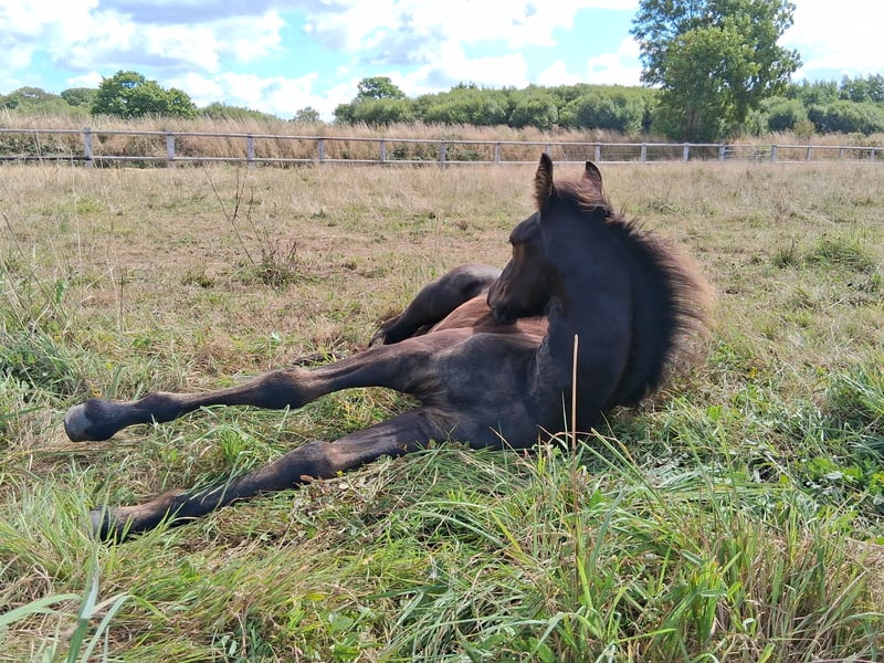 Zu reservieren Balzac, arabisch-friesisches Fohlen, geboren am 20. Mai 2025, Arabisch-friesischer Pass. Von Hermès Look DP (arabisch-friesisch) x Carla du Perche (Friesin, 3. Prämie) Anmeldung bei der EAFS und IFCE läuft. 70% Friesisch, 25% Hannoveraner, 5% Araber Verfügbar zur Reservierung für eine Adoption ab Dezember Sehr anhängliches und neugieriges Fohlen, perfekt im Umgang, ideal für die Pferdetherapie oder Freizeitaktivitäten Wird als Hengst oder kastriert verkauft. Für sehr seriöse Familien Besichtigungsort zwischen Granville und Avranches (50) Weitere Informationen gerne per PN