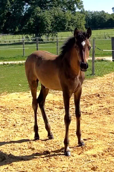 Born at the end of May 2025, AYLAN is a bay colt with typical primitive markings of the Dun gene: leg stripes, a dorsal stripe, and a cross stripe. His gaits are very light with good propulsion and amplitude. Independent, cautious, and clever, Aylan enjoys playing and shows affection when he knows the person. His pedigree suggests that he will stand around 1.55 m. Like all foals, he is handled, vaccinated, dewormed, and supplemented if necessary. Raised in a group, he will be weaned late but is available for reservation now. His price will increase with age and training progress. Several other horses are available for sale at the breeding farm, feel free to check the "Haras du Gremillon" website and contact via SMS for more information.