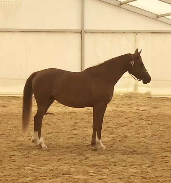 This beautiful filly has a lovely chestnut coat with reddish highlights, very fine skin with a stripe and three high white socks. She will measure between 1.50 and 1.55 m as an adult. Elegant, harmonious, with a fine and slender profile, Komète shows airy and fluid gaits, but also a lot of balance and beautiful amplitude. With a timid yet curious character, this young filly needs to be tamed to gain her trust. Affectionate once she knows the person, she is very attentive to her surroundings and will be disciplined and focused like her mother. Versatile, her lightness and propulsion are a plus for sports disciplines such as jumping, flat work, dressage, but also for outdoor activities. Currently in the process of being backed, she is also being worked with in free work and on the ground. Her price evolves with the progress of her training. Like all our horses, Komète is vaccinated, dewormed, supplemented, and regularly monitored for dentistry as well as osteopathy. All our foals are handled, raised in groups, and especially weaned late around 10 or 11 months for their balance. Several other horses are available for sale at the breeding farm and can be seen on the Haras du Grémillon website. Please do not hesitate to contact us via SMS for more information.