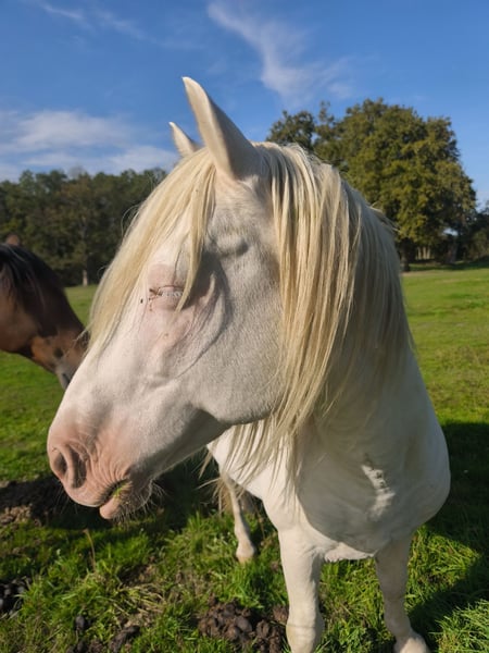 Quarter Horse x Lusitanian, OC type Aztec stallion Bhaiti is a 14-year-old breeding stallion with a cremello coat. He will automatically pass on his cream gene to his offspring. He can also transmit his piebald gene. Unbroken stallion, very gentle with us, up-to-date on vaccinations, deworming, and farrier care. Respectful of fences. He lives with mares and foals and will be easily backed. For more information, please contact me privately. Photos of his descendants available upon request.