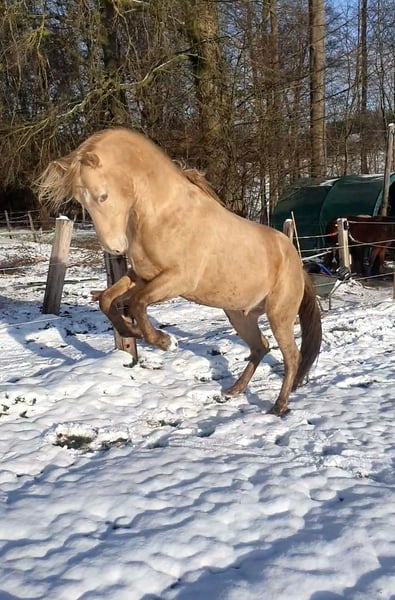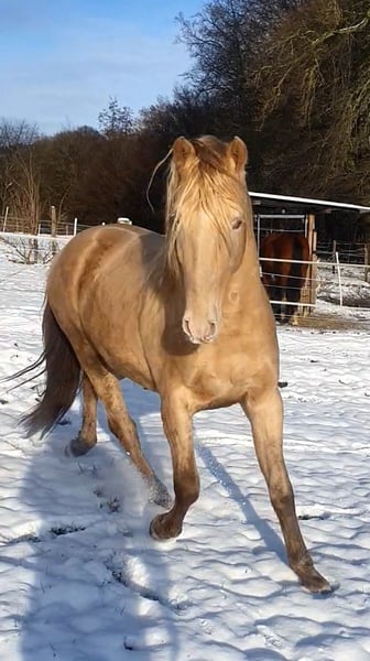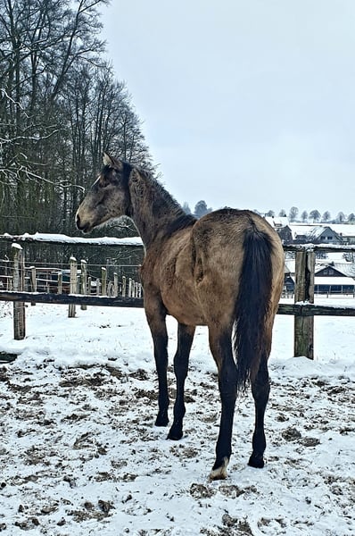 ✨ Absolute Ausnahme-Offerte: Azteca Jungstute in Traumfarbe ✨ Zum Verkauf steht eine vielversprechende, 1-jährige Azteca B Stute, die nicht nur durch ihre Optik, sondern auch durch ihren Charakter und ihre Gangqualität besticht. Evita wird in den USA registriert und bekommt Papiere der AAHIA Eckdaten: Rasse: Azteca (Lusitano x Azteca D) Die Mutter ist eine direkte Tochter vom portugiesischen Olympia Teilnehmer Viheste AR. Der Vater ist mein Azteca Nachwuchshengst SOL shining Star PR, direkter Sohn von Paco Martis Ausnahmehengst SOL PM. Elterntiere sowie die Oma sind vor Ort. Alter: 1 Jahr (geb. 05/25) Farbe: Buckskin Sooty (wird ein wunderschönes, dunkles Gold mit markanter Schattierung) Geschätztes Endmaß: ca. 160 cm Standort: 32257 Charakter & Gebäude Diese junge Dame vereint das Beste aus zwei Welten: Den Stolz, Mut und die Eleganz der portugiesischen Pferde gepaart mit der Gelassenheit und dem korrekten Fundament des Aztecas. (letzte Fotos zeigen den Vater) Sie zeigt sich altersgemäß neugierig, menschenbezogen und sehr lernwillig. Sie kennt das Fohlen-ABC, Anhänger fahren, gibt brav die Hufe und lässt sich überall anfassen. In der Herde zeigt sie sich sozial und unerschrocken. Potential Durch ihren kompakten, kräftigen Körperbau und ihre Wendigkeit eignet sie sich später hervorragend für: Working Equitation (ihre Paradedisziplin!) Freizeitreiten auf hohem Niveau Show & Liberty Zucht (aufgrund der seltenen Farbe und des korrekten Gebäudes) Aufzucht Sie wächst artgerecht im Herdenverband mit viel Bewegung auf. Sie ist regelmäßig entwurmt, dem Schmied vorgestellt und erhält hochwertiges Mineralfutter für eine optimale Skelettentwicklung. Ich suche für diese besondere Stute ein förderndes 5-Sterne-Zuhause mit Familienanschluss Kontakt: Bei ernsthaftem Interesse freuen Evita und ich uns über eine Nachricht.