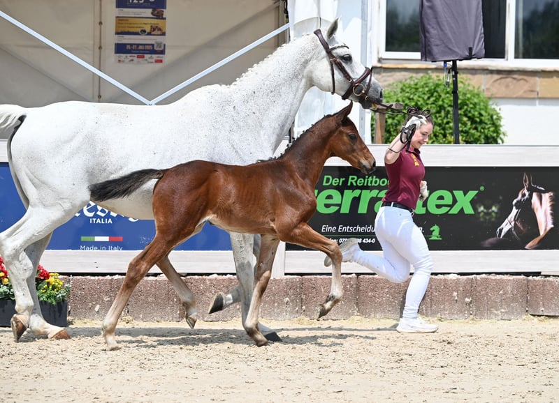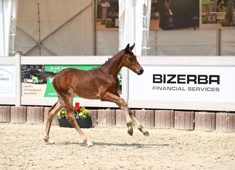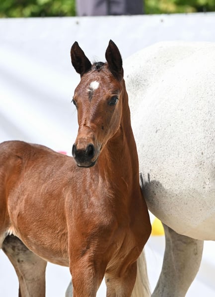 Springfohlen zu verkaufen – Cleo Blue (Württemberger Stute, 2025) Exzellente Blutlinien – Moderne Optik – Zucht- & Sportperspektive Wir bieten ein außergewöhnliches Württemberger Stutfohlen aus erstklassiger Springabstammung zum Verkauf an: Name: Cleo Blue Geboren: 26.04.2025 Geschlecht: Stute Farbe: Braun mit einem auffälligen weißen Stern Zuchtverband:Württemberger Abstammung: Vater: Charthago Blue (Chacco-Blue x Carthago) Der vielbeachtete Charthago Blue vereint die Gene zweier internationaler Top-Vererber: Chacco-Blue, aktuell weltweit führend in der Springpferdezucht laut WBFSH, sowie Carthago, der unter Jos Lansink zweimal an Olympischen Spielen teilnahm. Charthago Blue stammt aus der renommierten Zucht von Gerd Sosath und hat selbst sowohl im internationalen Sport als auch in der Zucht bereits Eindruck hinterlassen – mit Nachkommen, die durch Vermögen, Rittigkeit und Einstellung glänzen. Mutter: Chandelier(v. Cornet Obolensky x Landadel) Die Mutterlinie bringt ebenso internationales Format mit: Cornet Obolensky – Teilnehmer an Olympischen Spielen und fester Bestandteil der deutschen Nationalmannschaft unter Marco Kutscher – zählt zu den einflussreichsten Springvererbern der letzten Dekade. Seine Nachkommen gewannen bereits Millionen im internationalen Sport (u.a. Clooney 51, Comme Il Faut, Balou du Reventon). Chandelier selbst überzeugt mit sportlicher Eleganz und besten Interieurwerten, geprägt durch das blutgeprägte Mutterstamm-Potenzial über Landadel– ein Garant für Rittigkeit, Fundament und Springmanier. Cleo Blue – das Fohlen: Cleo Blue vereint modernes Exterieur mit klaren, elastischen Bewegungen und einem aufgeweckten, intelligenten Wesen. Sie zeigt jetzt schon eine hervorragende Galoppade. Besonders hervorzuheben ist ihre Ausstrahlung – mit dem markanten weißen Stern auf dem Kopf und einem eleganten Rahmen ist sie ein echter Blickfang. Besonderheiten & Perspektiven: * Hochinteressant für Sport & Zucht * Beste Springabstammung – international bewährt * Modernes, korrektes Fundament & sportlicher Typ * Bereits halfterführigund dem Tierarzt vorgestellt