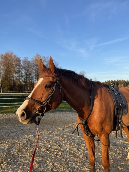 Sunny is a handsome, lively gelding, trained up to L/M level in dressage (shoulder-in, leg-yield, and canter lateral movements work well; light pirouette attempts are evident) and up to L in jumping. He enjoys working and needs a sensitive and consistent rider and companion who is willing to spend time with him and engage with him. Unfortunately, I currently lack the time, as I am under exam stress and plan to study afterward, which means I wouldn’t be able to give him the attention he deserves. He is very sociable and non-dominant around other horses, able to stand with mares or geldings in mixed herds, and enjoys social contact. He has always been exercised in a varied manner (arena, indoor, and outdoor riding). Currently, he is on a break due to an injury sustained five months ago. At the moment, he is building up his strength through walk-only work, walking 1 to 1.5 hours daily. The veterinarian is very pleased with his healing progress. Throughout the entire recovery period, a thorough therapy program was followed, and during the last vet check in November, he was completely sound again. Nevertheless, Sunny should continue walking only for some time before gradually resuming training. He is well-behaved for the farrier, loading is no problem, and he has already competed at shows and attended clinics multiple times. Vaccinations and deworming have been kept up to date. Important: He is currently not available for trial riding. Reining videos are available and can be provided upon request.