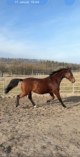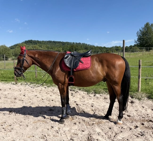 Dream horse ready to ride and have fun right away! This gelding wants to do everything right and simply makes every day enjoyable. Such a horse is rarely found on the market, priced accordingly to quality. He also comes from an excellent pedigree (Grannus on the dam’s side). I can easily imagine him as a first large horse for a pony beginner, especially if an adult rider would ride him once a week. He is familiar with lunging. Also suitable for a confident re-entrant rider. Very rideable, with a bit or bitless. Ready for jumping courses. Introduced to competitions up to A-level show jumping (most recently in 2023). Barefoot, uncomplicated at the blacksmith. Vaccinations up to date. Regularly seen by osteopath and dentist. He knows free jumping, ground work, lunging with a cavesson, cavaletti exercises, and works on the riding arena and in the indoor. He prefers to be turned out with a partner or with visual contact to others (also easygoing in a shared herd). He can go alone or in a group in the terrain. No bucking, no wrong steps. But he’s not a sleepwalker either. He thrives in the course but remains manageable at all times. He always jumps, adjusting himself if needed. Has never refused a jump! He can be groomed, ridden, and loved by children. ☺️ He also tolerates a break of 1-2 days without “exploding.” No bad habits, does not paw when tied, etc. Simply well-behaved and mentally clear. (He doesn’t like clipping much, should be lightly sedated for that.) He has never been seriously ill with me. Had one sarcoid on his ear, which was removed in 2023 and has not returned. Currently receives twice daily grain (oat-free), mineral supplement, and plenty of hay! AKU from the equine clinic from 2021 available. He is not offered for box stall housing. I want to see the stable beforehand. I reserve the right to repurchase. A fee of €25 will be charged for trial riding to prevent riding tourism. A new brand saddle (17“ jumping saddle from October 2025), fitted to him, can be purchased at an additional cost. He is being offered due to changed life circumstances. Not an emergency sale! (More details gladly in private.) Please only acquire a horse if you can afford it long-term (purchase price plus ongoing costs for at least 10 years). I wish for a home where he is worked with thoughtfully and lovingly, and where someone takes the time he deserves! No installment purchases, no leasing!