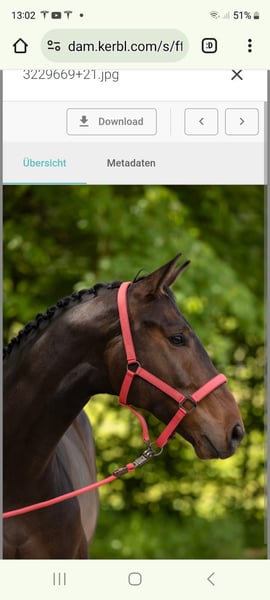 Fideroy comes from the best dressage lines: his sire Fidertanz and his dam's sire Donnerschlag speak for themselves. He has tactful, big movements that are easy to sit due to his compact body and active hindquarters. In a black-brown jacket and constructed uphill, he looks very elegant. The Kerbl company has currently used him as a model for its catalog (see photos). Fideroy is a real gentleman to handle, friendly, well-behaved and strong-nerved. He also moves calmly and courageously in the field. Fideroy has several full siblings who have won up to medium dressage level. He himself is well broken in and ready for novice level dressage horses, but has not yet been shown. We have not had any dressage-enthusiastic riders in the last 10 months. Due to the lack of competition experience and the sale of our farm for health reasons, he will be sold to a suitable rider at a reasonable price. Although he clearly belongs in dressage due to his talent, he would also be suitable for an amateur who is looking for a double-talented horse, possibly also for equitation. Florentin likes to jump and is quite capable. Good x-rays are available