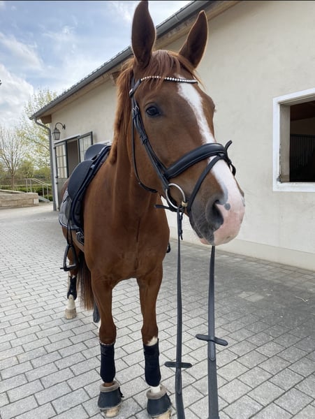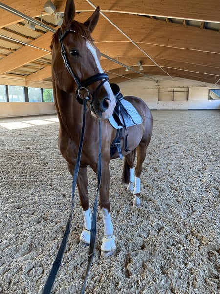 Toblerone – affectionately called "Chocolate" – is an expressive Bavarian Warmblood with excellent potential for dressage. His talent was recognized early: as a foal, he was the champion foal at the Munich-Riem foal show. No wonder – his grandsire is none other than Totilas, one of the most famous dressage horses in the world. Currently, Toblerone competes at the level of Dressage Horse L. He handles small jumps bravely – although his main talent clearly lies in dressage. He is always motivated and eager to learn. Important: Toblerone is not suitable for beginner riders. He has a strong personality – sometimes stubborn, but always brave. His rider should be confident, consistent, and empathetic, as Toblerone needs clear leadership and a purpose. He is not suitable for weaker or nervous riders – but those who enjoy a sensitive, powerful horse with genuine development potential will find great joy in him. He has not yet been shown in competitions, as I have no ambitions in that direction. However, he has always been well-behaved on unfamiliar riding surfaces and in new environments. Chocolate means a lot to me – therefore, he will only be sold to the very best hands. Place before price.