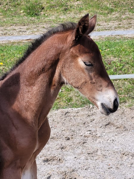 Dorian G ist das erste Fohlen aus einer hochdekorierten Mutter. Emilia du Rouet ist nach ihrem Vater Balou du Rouet und ihrer Mutter Emilia benannt. Der Vater zählt zu den weltbesten Vererbern im Springen und in der Vielseitigkeit, die Mutter war Staatsprämienstute und süddeutsche Vize-Championess der sechsjährigen Vielseitigkeitspferde. Sie war für das Bundeschampionat qualifiziert und holte mit einem älteren Amateur ca 130 Platzierungen im Springen (bis M**) in der Vielseitigkeit und in der Dressur (bis Kl. L). Emilia du Rouet ist ihrer Mutter im Exterieur und Interieur sehr ähnlich. Sie ist freundlich und unkompliziert im Umgang, mutig und selbstbewusst, ehrgeizig aber stets kontrollierbar. Sie legte eine gute Stutenleistungsprüfung ab und wurde auf der bayerischen landesstutenschau 2023 mit dem ersten Preis ausgezeichnet. Da sie die einzige Tochter ihrer Mutter Emilia ist haben wir sie zunächst in die Zucht genommen um diese Leistungslinie fortzusetzen. Sie brachte in 2024 ein goldprämiertes Hengstfohlen von Dinken. Dorian G erhielt bei der Fohlenschau in Ising für alle drei Gangarten eine 9 und die hohe Gesamtpunktzahl von 43,5. Dorian G ist sehr hübsch, hochelastisch und vielseitig begabt. Charakterlich kommt er ganz nach seiner Mutter, ist freundlich, menschenzugewandt und mutig. Bei seinem ersten Ausflug zur Fohlenschau sprang er noch vor seiner Mutter auf den Anhänger. Aus heutiger Sicht kann er zweifellos als Hengstanwärter gelten. Da wir altersbedingt die Zucht reduzieren und seine Mutter erneut von Dinken tragend ist steht er zum Verkauf - nur in allerbeste Hände.