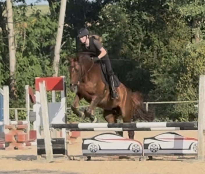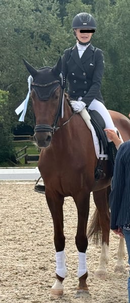 For sale is this lovely dark chestnut mare, who enabled our nine-year-old daughter to successfully transition to full-sized horses and significantly contributed to her success in E- and A-level dressage, as well as her inclusion in the perspective squad. Initially, the mare was ridden very straightforwardly with side reins and lunged, patiently supporting our daughter's development as a rider. Now, at 12 years old, both have progressed to confident L-level dressage tests and some M-level exercises. Thanks to her great enthusiasm for jumping, the pair has also gained valuable experience in show jumping courses. The mare is familiar with pole work, free jumping, lunging, overnight stays away from home, riding with a halter, and much more. Due to local conditions, we rarely went on trail rides ourselves, but her previous owner regularly included them in her routine. As she is a full family member, we are only offering her to loving and responsible owners. We hope she can once again help a child or young rider develop and flourish, or be supported by an ambitious recreational rider with the same care and respect. No pasture kept in a herd.