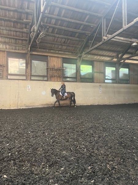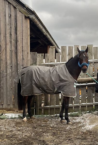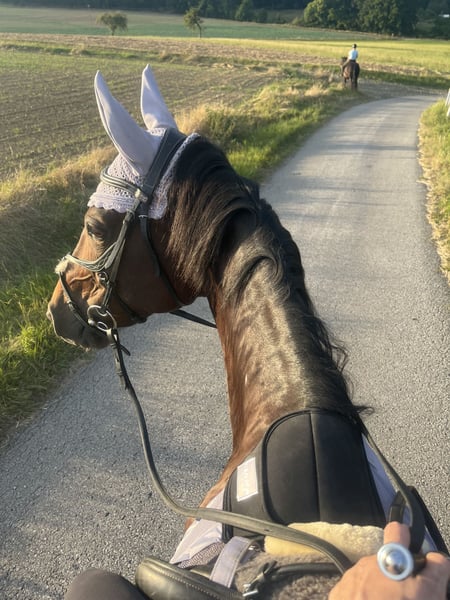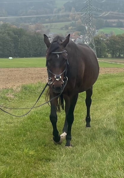 For sale is this lovely bay Warmblood mare. She is 15 years old, dark brown, and stands at 1.70 m. She is very child-friendly. I originally bought her for breeding, but unfortunately, it didn't work out in both breeding seasons. Since I don't have enough time to ride her, she is being ridden by a riding partner twice a week. I am therefore looking for a leisure rider for this pretty girl, who mainly rides out in the field, as she shows little motivation in the arena. She can only be motivated forward by good riders - weaker, less powerful riders may struggle with her as she tends to be dull, especially since she is not in training enough with us. Long trail rides (1-3 hours at a time in all three gaits) make her happy; she is an absolute lifesaver in the field and reliably carries weaker or more anxious riders calmly rather than hectically, allowing for true relaxation! She is also not a bolter and does not buck! With us, she rides out with an insecure gelding and provides him with confidence. In the field, she can really pick up speed but always remains safe and is easy to handle. My riding partner also sometimes rides out alone with her, which has gone well. Cars, hunting stands, motorcycles, etc., do not bother her even in the woods. She is currently vaccinated and will soon be dewormed again. She is well-behaved at the vet and farrier and loads well onto the trailer. She also loves trail and groundwork. She is very calm during grooming and has a gentle soul. She allows even a small child to groom her and can be washed in the summer. This is why she is being sold as a trail horse: The physiotherapist suspects the onset of mild arthritis, so it is important that the horse is often exercised and ridden where she enjoys it: in the field! She does not require any medication or special feed. She can be ridden barefoot if the ground is not too hard; otherwise, we recommend front shoes or hoof boots. Children have also sat on her, and she carries them safely and without misbehavior, as she really likes children. The mare is currently in a mare open stable (9 horses!) where she is the boss but gets along with everyone and remains fair. In a box, she shows food aggression during feeding and may hit the wall. A box without a neighbor or a feeding trough with sufficient distance would be advisable. However, we recommend open stable housing. With us, she receives hay 24 hours a day. This is not an urgent sale. Only to good hands, because she is a real sweetheart! She is not a breeding mare and is being sold as a trail horse.