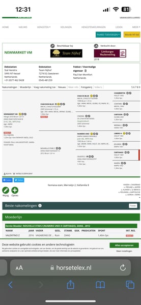 For sale: a beautiful gray mare, pregnant by Newmarket. Details: Mare's pedigree: Cachas x Lancer III Stallion's pedigree: Chacoon Blue x Numero Uno Covering date: April 22, 2025 Stallion station: Nijhof, successfully competing internationally up to 1.40 m (Mare, born in 2011): Carrera has won multiple classes at medium and large tour, with S level currently in training over jumps. We purchased Carrera as a three-year-old and trained her up to the advanced level. Throughout this time, she remained injury-free and we achieved several wins. She can therefore also be ridden after her breeding career. Due to our retirement from breeding, we unfortunately have to part with her... Only to the best hands!