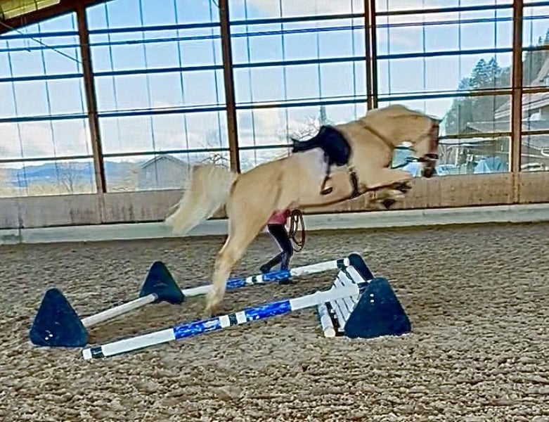 Joli poulain femelle de couleur palomino recherchée, doté de mouvements excellents ! C'est une offre exceptionnelle pour le dressage et, grâce à sa lignée polyvalente, elle est également intéressante pour le sport équestre polyvalent ! Le père « Alle Farben » était un étalon primé à Neumünster, vainqueur de la HLP avec d'excellentes notes et a remporté des compétitions de chevaux de selle de 3 ans, ainsi que champion hessois des Trakehners de 3 ans. Le grand-père maternel Bon Courage brille également dans le sport de dressage avec des victoires en S et une descendance exceptionnelle. La mère a terminé la performance des juments à 4 ans avec une note finale de 7,52, où le saut a également été noté à 7,5 ! Un descendant de la mère a été approuvé et a connu le succès dans des épreuves de sport équestre polyvalent. Un emplacement pour l'élevage avec les meilleures conditions serait disponible en cas d'intérêt.
