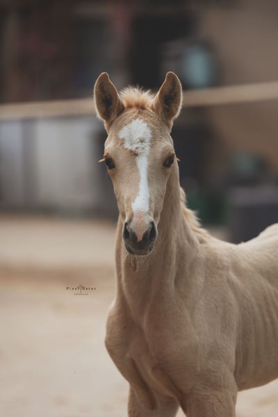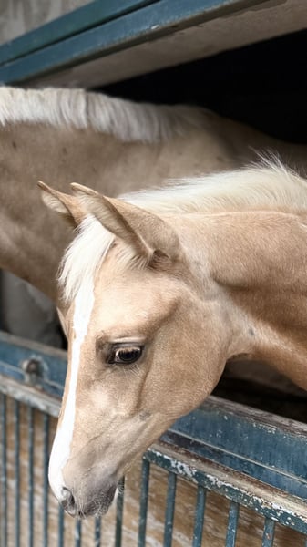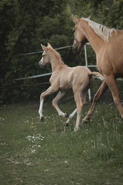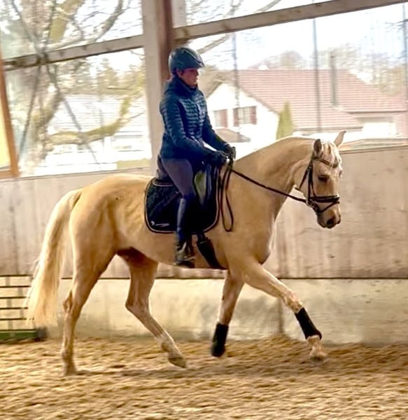 Stylish filly in the desirable palomino color, equipped with excellent movement! She is an outstanding offer for the dressage arena and, with her versatile pedigree, also interesting for eventing! Sire "Alle Farben" was a premium stallion in Neumünster, HLP winner with excellent scores, and has won 3-year-old riding horse classes as well as being the Hessian champion of 3-year-old Trakehners. The dam, Bon Courage, shines in dressage with S-level victories and outstanding offspring. The mother completed the mare performance test at 4 years old with an overall score of 7.52, with jumping also rated at 7.5! A descendant of the mother has been licensed and has been successful in eventing training classes. A raising place with the best conditions would be available if interested.