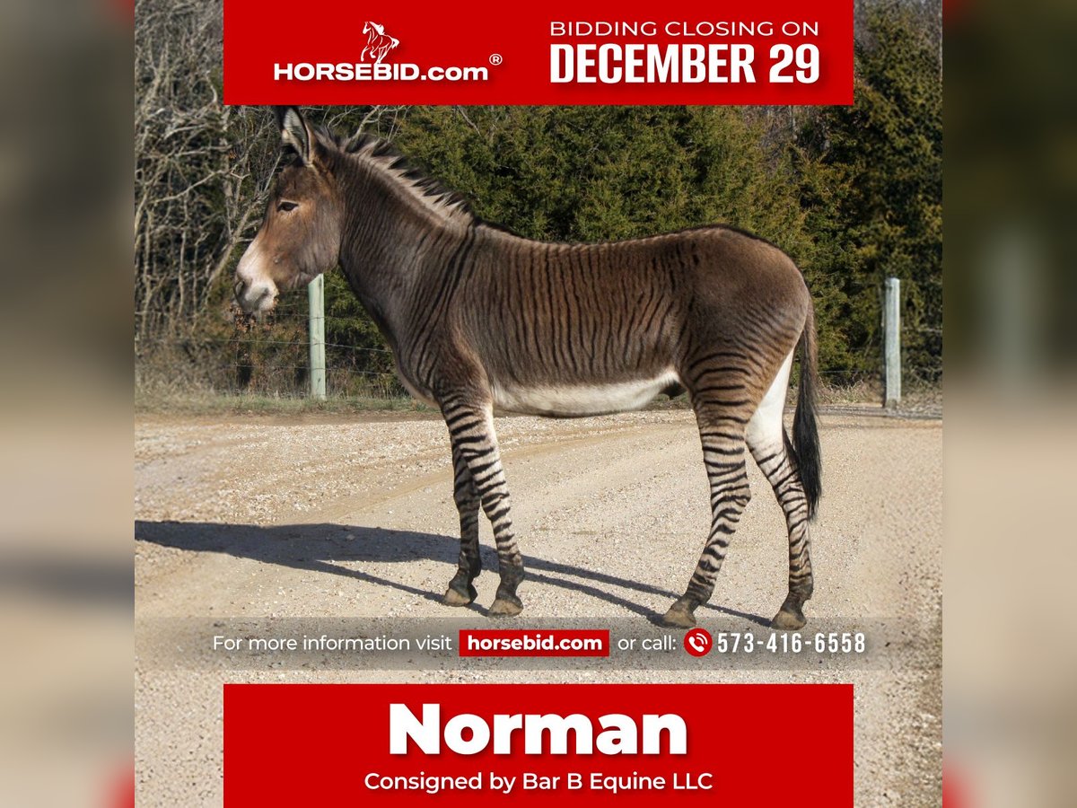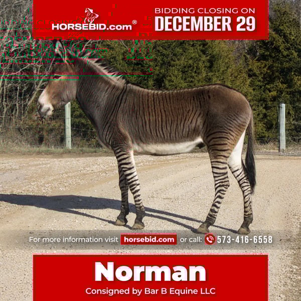 ⚜️𝐓𝐇𝐄 𝓗𝓮𝓻𝓲𝓽𝓪𝓰𝓮 𝐖𝐢𝐧𝐭𝐞𝐫 𝓒𝓵𝓪𝓼𝓼𝓲𝓬⚜️ Happening now thru MONDAY | DECEMBER 29th - Available EXCLUSIVELY on HorseBid's website! For more details and to register visit: www.Horsebid.com CONSIGNOR CONTACT: Bar B Equine LLC 573-416-6558 LOCATION: Owensville Missouri BREED: Zedonk REGISTERED: No REGISTERED NAME: Norman COLOR: Bay Dun HEIGHT: Approximately 56” AGE: 5 GENDER: Gelding Norman is a 5 year old Zedonk gelding standing approximately 56” tall. If you’re looking for uniqueness and diversity, Norman is the icing to your cake! Norman is always friendly, and gets along well with other pasture mates of equine, donkeys, and other hybrids. He picks up his feet well for the farrier and takes worming with ease. Norman was lightly started under saddle and harness as a 2 year old before traveling the country as a petting zoo worker. He is all about attention, and never misses an opportunity to get butt scratches or lovins! Norman is by far a personal favorite, and always catches the hearts of everyone near and far. His sheer beauty followed by his enjoyable personality makes him easy to love! Norman loves snacks and never misses a meal. He will come from across the pasture to meet and greet with all his two legged friends. He does well in pipe fencing and 5 strand barb wire, and also does well alone when needed. He will halter, lead, and load with kind manners. He enjoys carrots, crackers, and apples and is always gentle when taking them from your hands. He is friendly to rub and scratch all over including his rump, belly, and even his face! Norman does fantastic and adapts well to all sorts of climate, including Missouri’s bipolar weather patterns! I know he would suit any family well whether they’re on the coast or as far as the north can go! Norman has no current nor past medical concerns, and sells sound. If you’re looking to add a little pizazz to your family ranch and just don’t know quite where to find it, perhaps Norman is the critter for you! For anymore information or questions, no matter how silly, please message or call at 573-416-6558. Merry Christmas and happy bidding!!