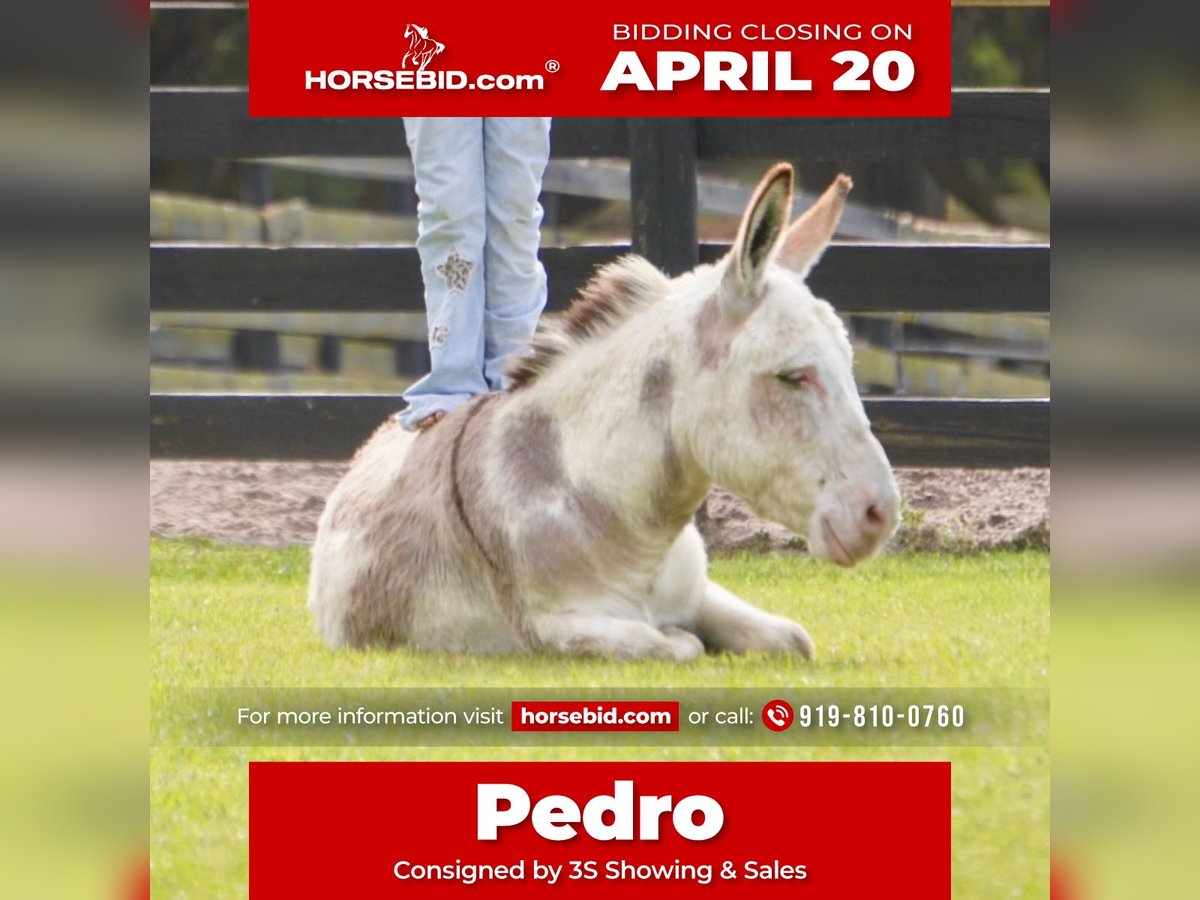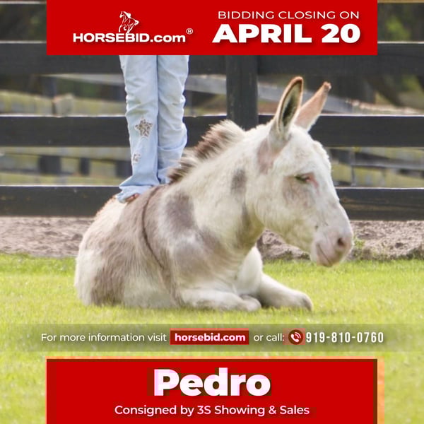 ⚜️𝐭𝐡𝐞 𝓔𝓵𝓲𝓽𝓮 𝐒𝐩𝐫𝐢𝐧𝐠 𝐂𝐥𝐚𝐬𝐬𝐢𝐜⚜️ Happening now thru MONDAY | APRIL 20th - Available EXCLUSIVELY on HorseBid's website! For more details and to register visit: www.Horsebid.com CONSIGNOR CONTACT: 3S Showing & Sales 919-810-0760 LOCATION: Ocala, FL BREED: Donkey REGISTERED: No COLOR: Paint HEIGHT: 39in AGE: 5 GENDER: Jack Pedro ✨ The most adorable little spotted donkey you’ve ever laid eyes on. Pedro is a 5 year old jack who is truly the heart of our farm. He is the kind of little guy everyone falls in love with the second they meet him. From his unique spotted coat to his kind, he’s impossible to walk past without stopping for a cuddle. He just loves people. He currently turns out peacefully with our mares and has the most gentle, easygoing demeanor. You truly wouldn’t know he’s a jack. His mind and temperament are what set him apart. Handled daily, Pedro is as broke and mannerly as they come. He ties, picks up all four feet, rides, and drives. We drive him down the rode and in heavy traffic. He will even lay down on command, making him the ultimate partner for a child or family looking for something extra special! Pedro isn’t just a donkey. He’s your best friend. We absolutely adore him. We know without a doubt he’s going to make someone very, very happy. 🤍 Shipping can easily be arranged anywhere!