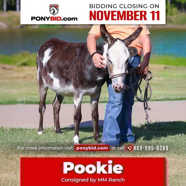 𝓽𝓱𝓮 𝐑𝐈𝐃𝐄𝐑'𝐒 𝓒𝓱𝓸𝓲𝓬𝓮 🐴 𝐏𝐎𝐍𝐘 𝐄𝐃𝐈𝐓𝐈𝐎𝐍 🐴 Happening now thru TUESDAY | NOVEMBER 11th - Available EXCLUSIVELY on Ponybid's website! For more details and to register visit: www.Ponybid.com CONSIGNOR CONTACT: MM Ranch 469-595-6289 LOCATION: Forney, TX BREED: Miniature Donkey REGISTERED: No COLOR: Paint HEIGHT: 34" AGE: 3 GENDER: Jenny 🫏3 yr old miniature black and white paint Jenny. Yes…a paint mini Jenny!!! This is Pookie. Pookie stands 34 inches tall. And again just 3 yrs old. She was hand raised, so she is extra sweet and gentle. Broke to lead, load, stand tied, picks up her feet easily, good for the farrier, easy to catch and handle. She has worn and been used to pack a little. But I would not say she is not broke to ride. (Just cause she is too little for most kids to ride) So no you cannot pack a lot on her BUT she is so cute wearing her little pack saddle around. And looks so cute for pictures. We put the pack saddle on her and put our drinks and lunch in it and packed her through the park. She is a pet. Loves attention. Loves to be around the kids and dogs. Loves her treats. She cannot wait to meet you at the gate to see what you have. She would be a perfect backyard companion or a perfect addition to anyone’s breeding program. ❤️She has no health problems. Excellent feet. Up to date on shots and worming. She is ready to go to her new home to be enjoyed. 🌎We can and will help arrange shipping if needed.