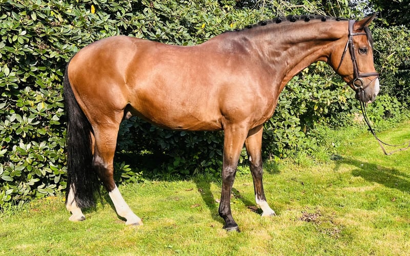 We are looking for a nice home for our Crysou (S: Comme il faut MV: Godolphin) He was born with us, was gently broken in at the age of 4 and has competed in show jumping up to elementary (L) level. Crysou is about 1.70 m tall. Particularly noteworthy is his exceptional sitting comfort in all 3 gaits! Crysou prefers to be ridden with fine aids and is always eager to please his rider. He is a pleasure to handle every day, whether in dressage, jumping or on rides. He is naturally fond of blacksmithing and loading and knows dogs, tractors and trucks. Crysou is compatible and friendly with other horses and loves to be petted by his humans. We would like a loving home for him, preferably with a family connection.
