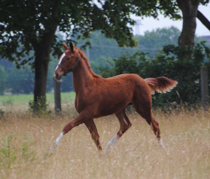 Come presagio della primavera, una volpe colorata ha aperto la stagione dei puledri di quest'anno. "Mon Ami" di Le Chevalier e Marjellchen di Marduc hanno stupito tutti. Che base forte, che eccellente attacco al collo e poi le dimensioni enormi. Con energia vitale in pochi minuti dopo la nascita sulle gambe e sulla mammella, quindi le prime impressioni. All'età di due giorni, il figlio più giovane della figlia di 20 anni Marduc ha fatto meglio nella sua prima passeggiata, in cui ha mostrato movimenti di primissima qualità. Una galoppata in salita degna di questo nome e momenti di trotto che ti fanno aspettare molto. Gli intenditori, naturalmente, registrano immediatamente la consanguineità desiderata sul nostro ex sire principale Marduc, che ha portato un successo visibile qui. Marjellchen, premiata con il premio dell'associazione allo ZfdP come cavalla espositiva nazionale ad Altefeld, sarà probabilmente una delle ultime figlie attive di Marduc. Suo figlio "Mon Ami" è ora registrato come cavallo di sangue nobile tedesco presso la ZSAA. Attendiamo già con impazienza la valutazione. Notevole è la sua grande somiglianza con il fratellastro paterno Lamiro, che purtroppo dobbiamo crescere senza una madre. Mon Ami è stato premiato con 2 stelle in occasione della Fohlenschsu.