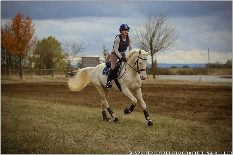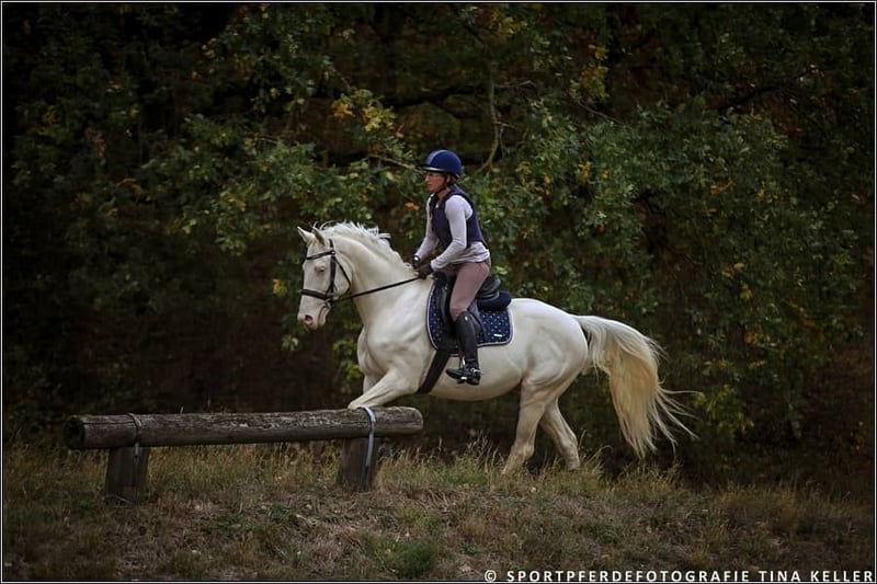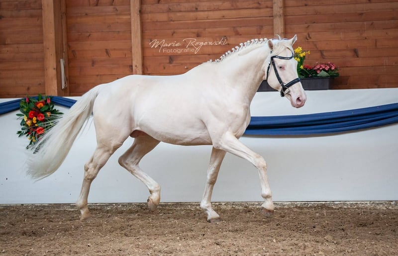 Warmblood stallion in Cremello (double dilute) | born 2010 | 169 cm AES, ZSAA (German Edelblut), Royal Belgian Palomino, licensed Approved for KWPN-A, Zangersheide, IFCE, ISR/Oldenburg N.A. 70-day stallion performance test Neustadt/Dosse + HLP-Sport Marbach Genetics: e/e A/a Cr/Cr ECVM: no findings (2022, international research programme) WFFS, CA, SCID: free Alasdair GF enjoyed many years of sporting success and was placed in cross-country competitions up to class L. In 2015, he was the youngest horse to take 9th place in the ZfDP TOP TEN eventing horses. He has produced colourful, athletically talented offspring worldwide – both in warmblood breeding and in partbred projects. Bred by Gestüt Falkenhorst (Gwendolyn Gregorio), Alasdair comes from a traditional colour and refiner line. His sire, RFF The Alchemist xx, was imported from the USA (Red Fox Farm) and was one of the first double lightened thoroughbreds with Trakehner approval in Germany. Alasdair is performance-tested, strong in character and clear in type. He consistently produces modern, strong-moving foals with substance, conformation and colour – 100% lightening with the appropriate gene combination. As a cremello, he always passes on a cream gene. Due to his genetic background, he is suitable for both classic warmblood mares and projects with breeding goals.