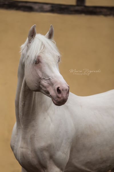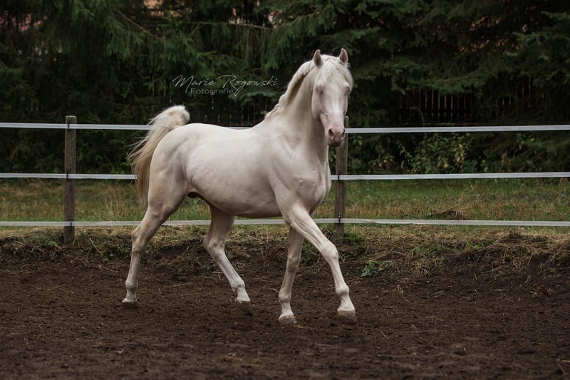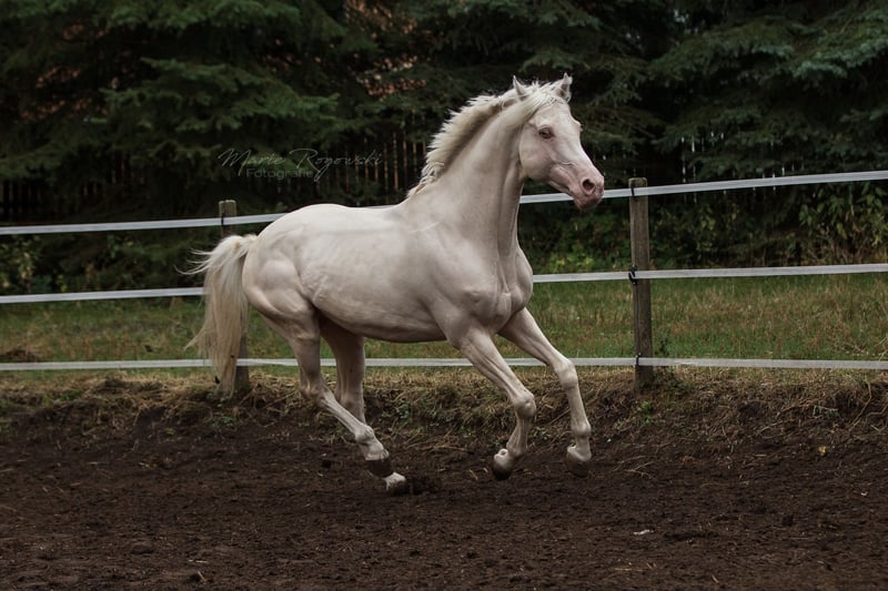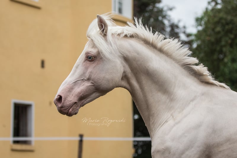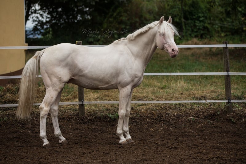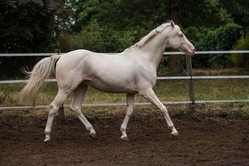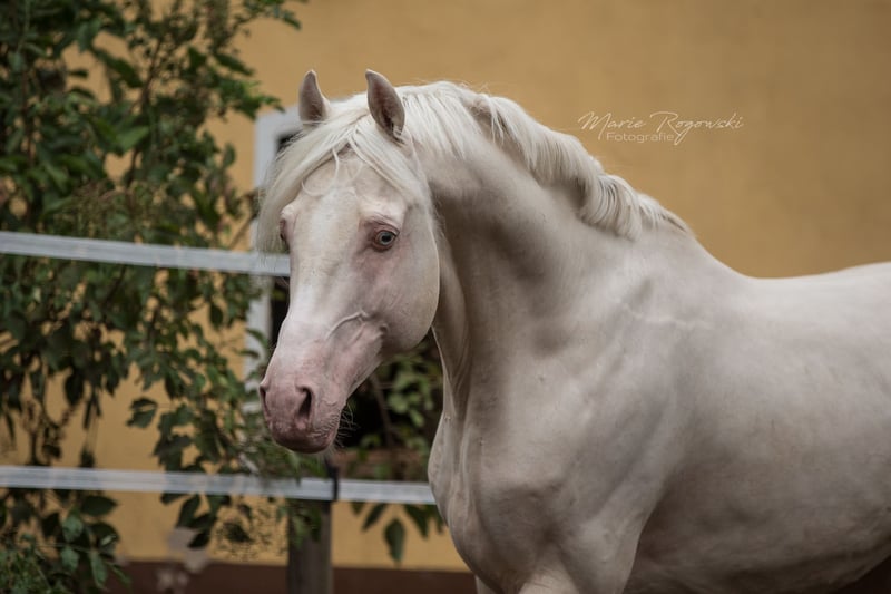 Warmblood stallion | Cremello | born 2009 | approx. 162 cm Approved by ECHA-ESV, approved for EASP Genetics: e/e A/A Cr/Cr Tested: ECVM without findings | SCID, CA, WFFS, PSSM2 negative Don Cream GF is a compact, correctly built Cremello stallion with a friendly nature and clear type characteristics. He passes on an expressive head, stable limbs and harmonious movements. In England, his offspring are successfully used in dressage and colour breeding. He lives year-round in an open stable with direct visual contact to the herd of mares and is friendly, calm and people-oriented. He is also reliably sociable with pregnant mares in large areas. Due to his genetic makeup, he is particularly suitable for colour breeding programmes, even when paired with double-lightened mares.