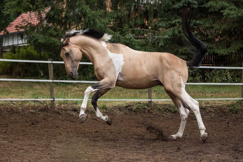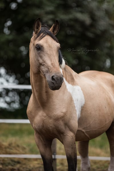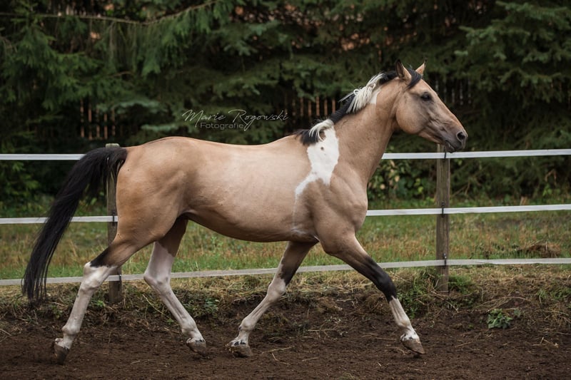 Caballo de doma alemán | Tobiano buckskin | 2007 | aproximadamente 1,70 m Aprobado por VZAP, AES, ECHA-ESV, ZfdP | Prueba de rendimiento de semental realizada (VZAP HLP 2014 - Nota 7.0) Registrado en Zangersheide y IFCE Francia Genética del color: Ee Aa Cr/n TO/n Testado genéticamente: SCID, CA, WFFS y PSSM2 - negativo Talisman GF es un semental de hermoso aspecto, bien conformado, con un llamativo color especial y ascendencia deportiva. Destaca por sus movimientos básicos de buen carácter, una disposición tranquila y una estructura armónica. En el día a día, Talisman se muestra equilibrado, confiable y atento. Vive en paddock abierto, es fácil de manejar, tiene experiencia en monta y está familiarizado con todos los procedimientos en la yeguada. Su pedigrí combina sangre deportiva sin líneas de Samber, Ico ni Camaro. El padre, Taarlon (caballo de élite, salto M), desciende de Rigoletto (Ramzes AA), y la madre, Morgenlicht GF, proviene de Morgengold II y Wilderer, de una línea con rendimiento probado, color, fundamento y buen carácter para la doma. Es padre de dos sementales aprobados: Traumprinz GF (Australia) y Tagtraum Falkenhorst Z (Alemania/Francia), además de varios ejemplares con éxito deportivo y en la cría en Europa y Suiza.