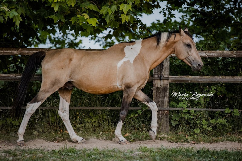 German riding horse | Buckskin Tobiano | 2007 | approx. 170 cm Approved by VZAP, AES, ECHA-ESV, ZfdP | Stallion performance test completed (VZAP HLP 2014 – score 7.0) Registered with Zangersheide and IFCE France Colour genetics: Ee Aa Cr/n TO/n Genetically tested: SCID, CA, WFFS and PSSM2 - negative Talisman GF is a beautifully shaped, correctly built stallion with a striking special colour and athletic pedigree. He impresses with his rideable gaits, calm temperament and harmonious physique. In daily handling, Talisman is balanced, reliable and attentive. He lives in an open stable, is easy to handle, experienced in covering mares and familiar with all the routines of everyday life at the stud. His pedigree combines athletic bloodlines without Samber, Ico or Camaro lines. His sire Taarlon (elite stallion, M-level show jumping) goes back to Rigoletto (Ramzes AA), while his dam Morgenlicht GF comes from a performance-tested line with colour, conformation and rideability via Morgengold II and Wilderer. He is the sire of two licensed stallions – Traumprinz GF (Australia) and Tagtraum Falkenhorst Z (Germany/France) – as well as several successful offspring in sport and breeding in Europe and Switzerland.