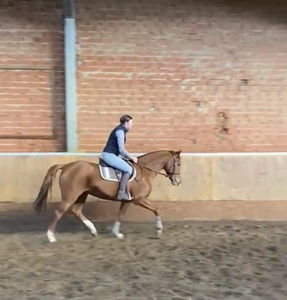 Casey is een 11-jarig vosmerrie met een schofthoogte van 1,61 m. Haar afstamming is helaas niet bekend. De afgelopen jaren is ze recreatief bereden, waarbij bleek dat Casey consequente training met een ruiter nodig heeft die ook mild kan testen. Buitenritten gaat ze goed, ze heeft wat go, maar blijft goed handelbaar. Sinds enkele weken wordt ze professioneel gereden en is begonnen met cavaletti- en springtraining. Hier toont Casey veel plezier en talent voor. Een recent keuringrapport is niet aanwezig, ze staat nog niet ingeschreven als wedstrijdpaard. Locatie: 32425 Minden Video’s graag via WhatsApp op 0176-70349915