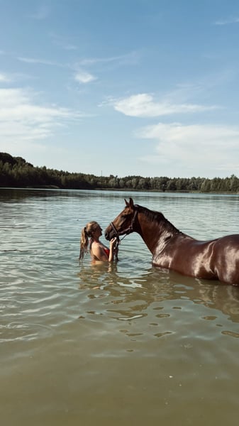Hiermit suche ich ein neues zu Hause für meine Traumstute Liberty. Wir haben viel zusammen erlebt. Sie geht super gerne ins Gelände und ist dort ein absolutes Verlasspferd. Ich war mit ihr an Seen, am Stand und gerne im umliegenden Gelände unterwegs. Mit ihr macht es einfach Freude durchs Gelände zu reiten. Sie ist ein Pferd, welches gerne arbeitet und die Aufmerksamkeit von ihrem Menschen genießt. Bodenarbeit und Kuscheln stehen ebenso auf ihrer Favoritenliste. In der Dressurarbeit ist sie sensibel und benötigt aufgrund dessen einen Reiter der nicht ängstlich und kein reiner Anfänger ist. Sie geht Seitengänge, sowie fliegende Wechsel und lernt schnell dazu. Dort kann man sicherlich mit der richtigen Einstellung viel Spaß mit ihr haben. Ich selbst bin eher im Springsattel zu Hause. Die letzten zwei Saisons bin ich sie bis A Springen auf Turnier geritten. Leider ist aufgrund eines Befundes dies nicht mehr möglich. In der täglichen Dressurarbeit oder alltäglichen Umgang ist sie nicht eingeschränkt. Dazu aber gerne im persönlichen Gespräch mehr. Ich wünsche mir für sie ein zu Hause, indem sie wieder die volle Aufmerksamkeit bekommt und ohne Turnierstress ein schönes Freizeitpferdeleben führen darf. Bei Interesse oder Fragen meldet euch gerne bei mir per WhatsApp. 015755824464