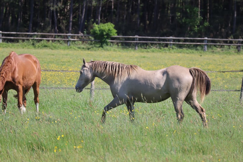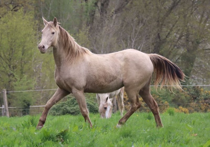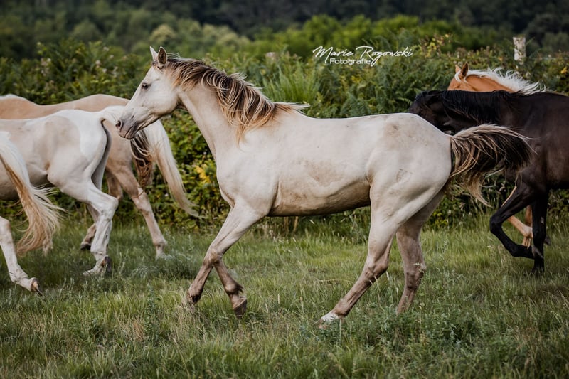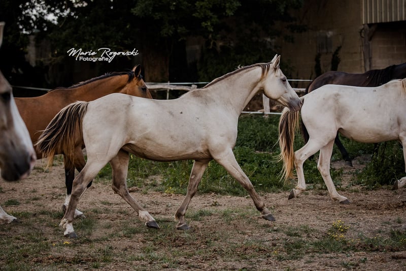 Warmblutstute | Classic Champagne | geb. 2014 | 1,50 m Stutbuch I Genetik: Rappe mit heterozygot Champagne, E/x a/a Ch/n KHREME KHASSIS GF ist eine ruhige, sozial eingebundene Stute mit Überblick und innerer Gelassenheit. Sie ist menschenfreundlich, lernbereit und bewegte sich bisher sicher in stabilen Herdenstrukturen. Sie wurde nicht geritten und ist nicht an regelmäßiges Handling gewöhnt – bietet aber aufgrund ihrer klaren Art und ihrer Abstammung Potenzial sowohl für die Zucht als auch für eine spätere Ausbildung im Freizeitbereich bei geduldigen, erfahrenen Menschen. Vater: RAPPTÄNZER – Oldenburger Dressurblutlinie mit Rubinstein I – Rosenkavalier – Inschallah AA. Erfolgreich bis Grand Prix, mit bewährter Nachzucht Mutter: KHREMISSIMA GF – erste champagnefarbene Stute im Warmblut-Stutbuch I, aus der Palomino Zweibrücker Hauptstutbuchstute MAIGOLD Muttervater: KHALVIN KHLEIN KpM (USA) – Begründer der modernen Champagne-Partbred-Linie in Europa