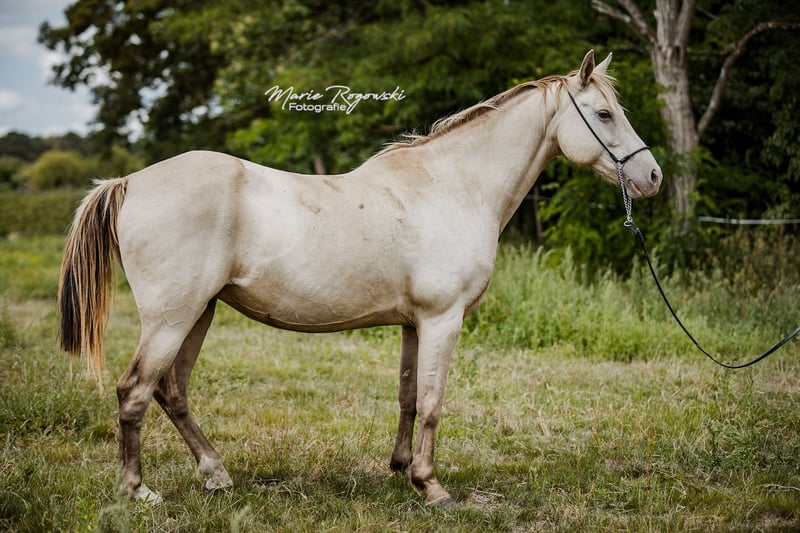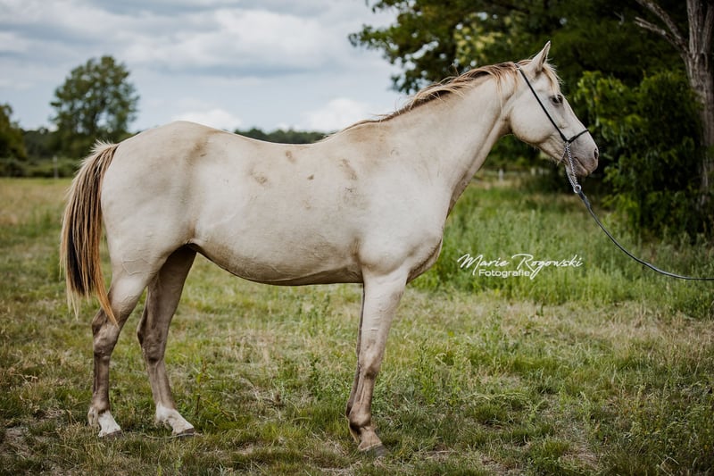 Warmbloedmerrie | Classic Champagne | geb. 2014 | 1,50 m Stamboek I Genetica: Zwart met heterozygoot Champagne, E/x a/a Ch/n KHREME KHASSIS GF is een rustige, sociaal geïntegreerde merrie met overzicht en innerlijke kalmte. Ze is mensvriendelijk, leergierig en heeft zich tot nu toe veilig bewogen in stabiele kuddestructuren. Ze is niet bereden en is niet gewend aan regelmatig omgaan – maar biedt door haar duidelijke karakter en haar afstamming potentieel zowel voor de fokkerij als voor een latere opleiding in de vrijetijdssport bij geduldige, ervaren mensen. Vader: RAPPTÄNZER – Oldenburgse dressuur bloedlijn met Rubinstein I – Rosenkavalier – Inschallah AA. Succesvol tot Grand Prix, met bewezen nageslacht. Moeder: KHREMISSIMA GF – eerste champagnekleurige merrie in het Warmbloed Stamboek I, uit de Palomino Zweibrücker hoofdstamboekmerrie MAIGOLD. Moeder vader: KHALVIN KHLEIN KpM (VS) – grondlegger van de moderne Champagne-Partbred-lijn in Europa.
